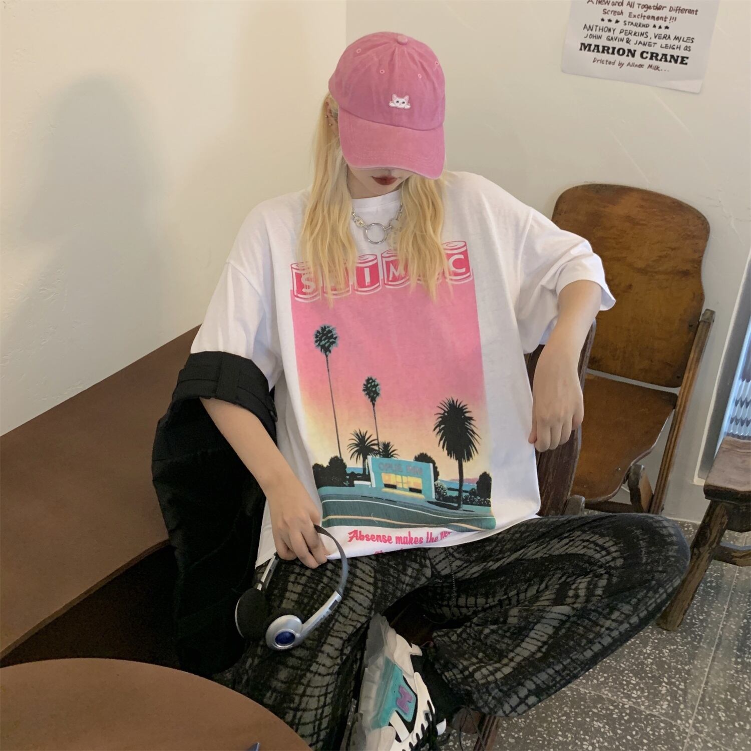 ホワイトTシャツレディース夏服韓国ファッショントレンドスタンダードプリントトップス レトロ 夏物 ボーイズ スタイル デーモン1727210700