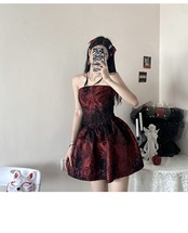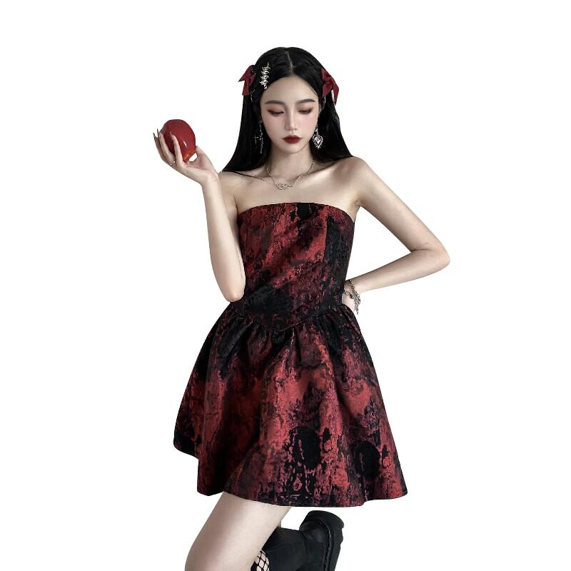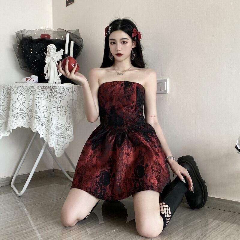 トップス スカート レッドジャカード夏服ワンピースレディースワンショルダー ストリート 夏物 CHIL23119383598