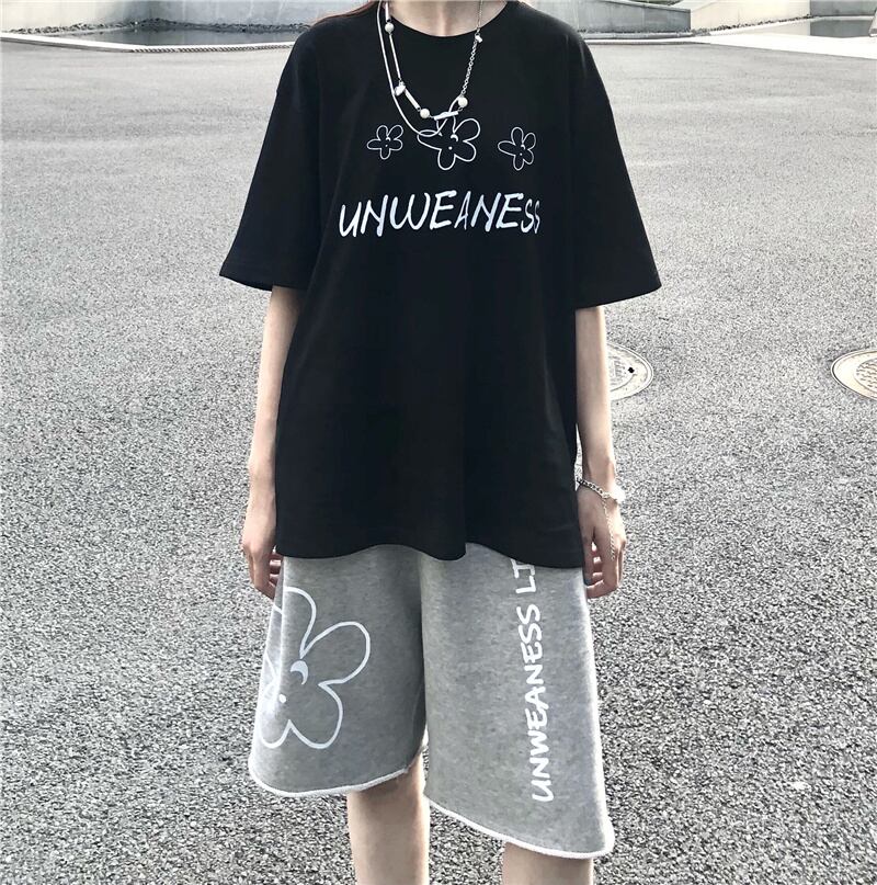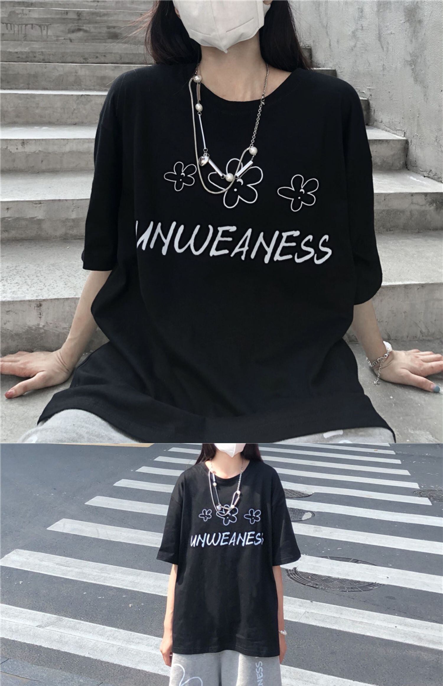 ブラックトップス レディース夏服韓国ファッショントレンドFlowerデザイン プリントルーズTシャツ 夏物 フラワーデザイン スタイル デーモン63934998382