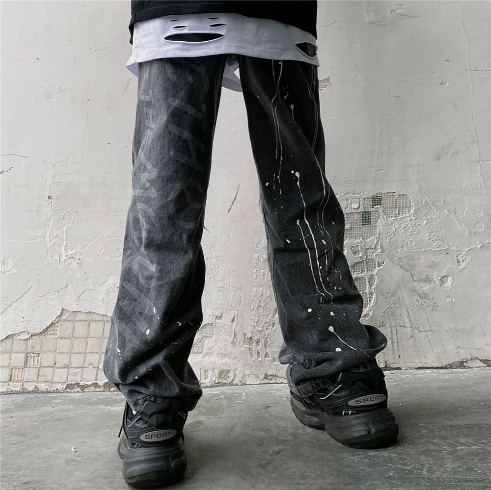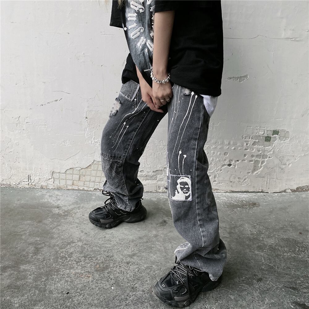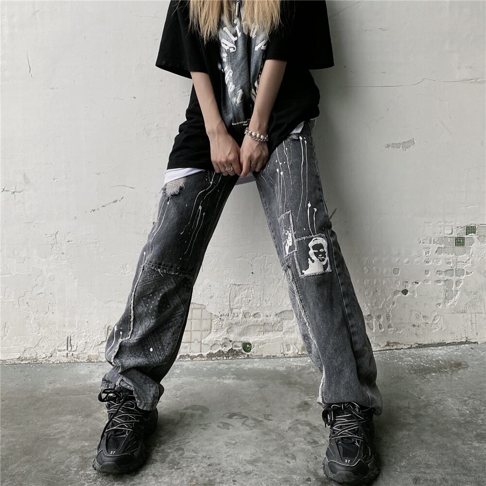 ジーンズ レディース夏服トレンドダークプリントワイドレッグパンツ ハイウェストウェストスリムルーズ 夏物 ワイドパンツ ウエスト デーモン27280365165