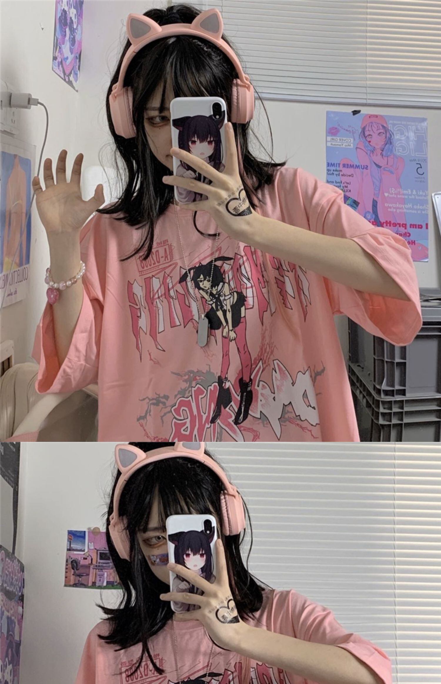 夏服レディース韓国ファッショントレンドスタイルプリント柄ルーズトップス Tシャツ ピンク 原宿 夏物 ボーイズ デーモン96867382664