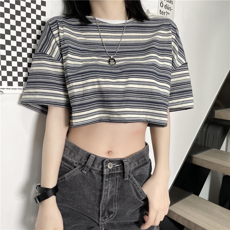 夏服ショートTシャツレディース韓国ファッショントレンドスタンダードストライプルーズラウンドネックトップス レトロ 夏物 Oネック スタイル デーモン57689715201