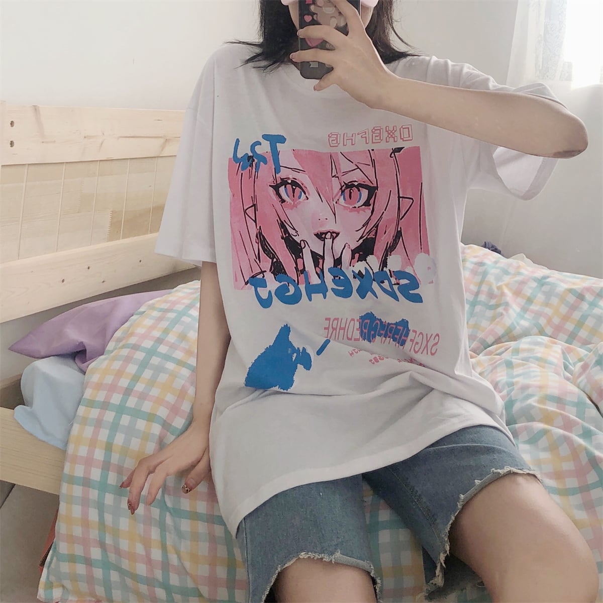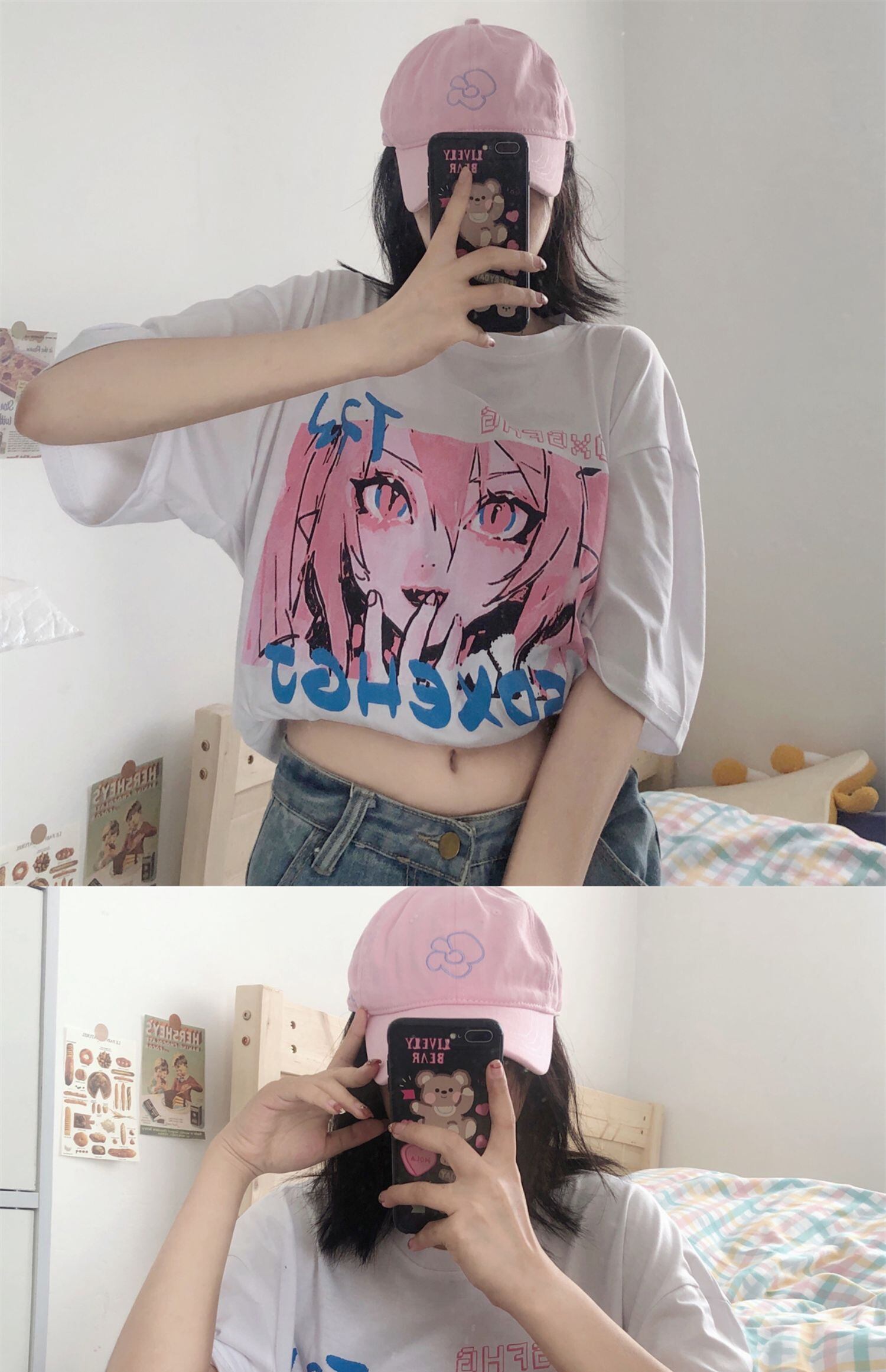ホワイトTシャツレディース夏服韓国ファッショントレンドプリントルーズラウンドネックトップス 夏物 Oネック スタイル デーモン98097654310