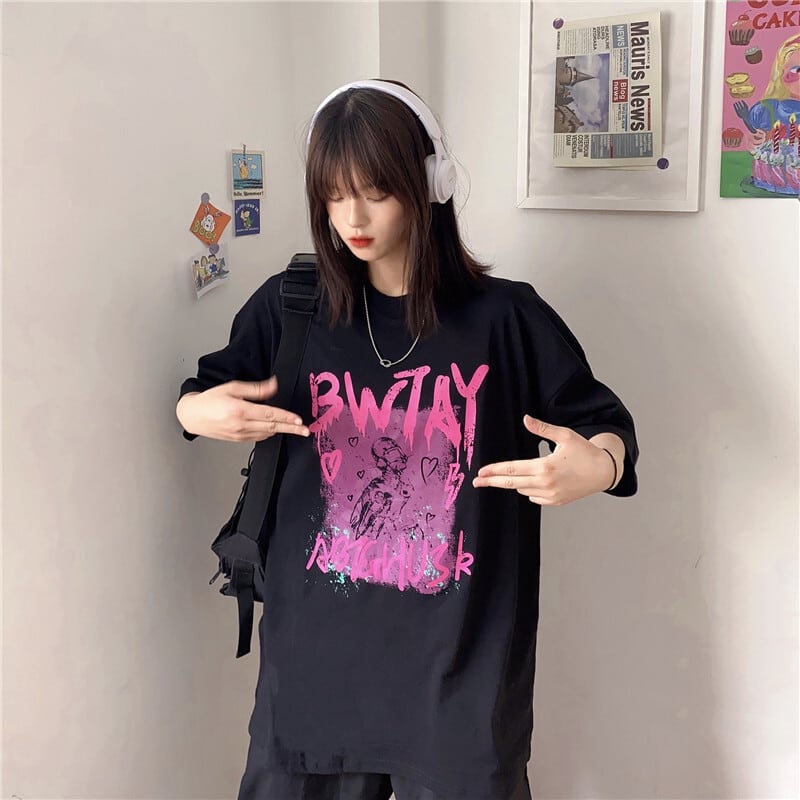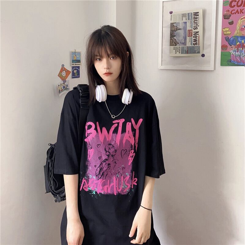Tシャツレディース夏服韓国ファッショントレンドプリントブラックルーズトップス 夏物 スタイル デーモン60818743529