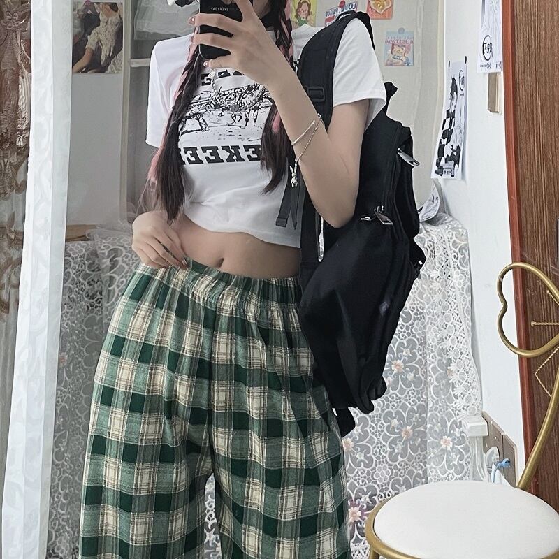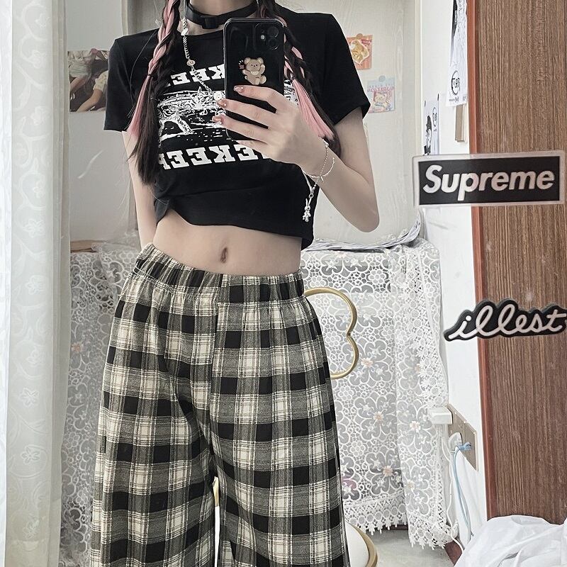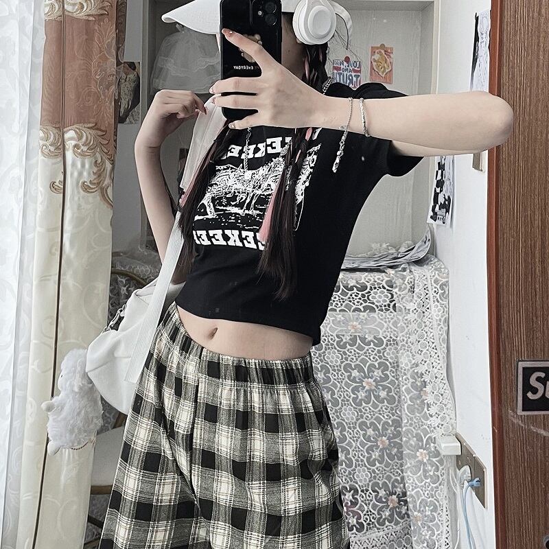 夏服レディーストレンドショートTシャツトップス ルーズ格子柄パンツ 夏物 デーモン62562357898