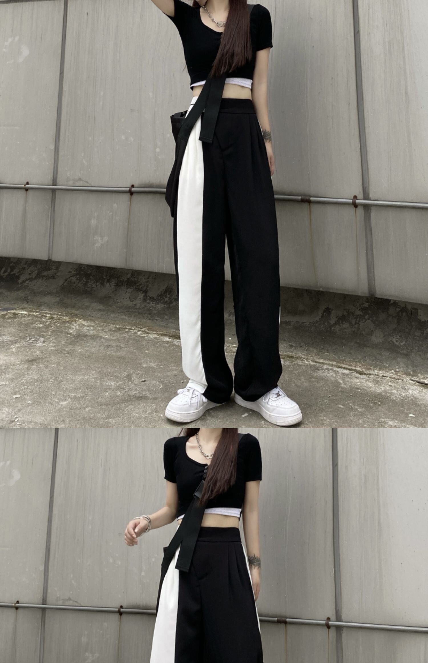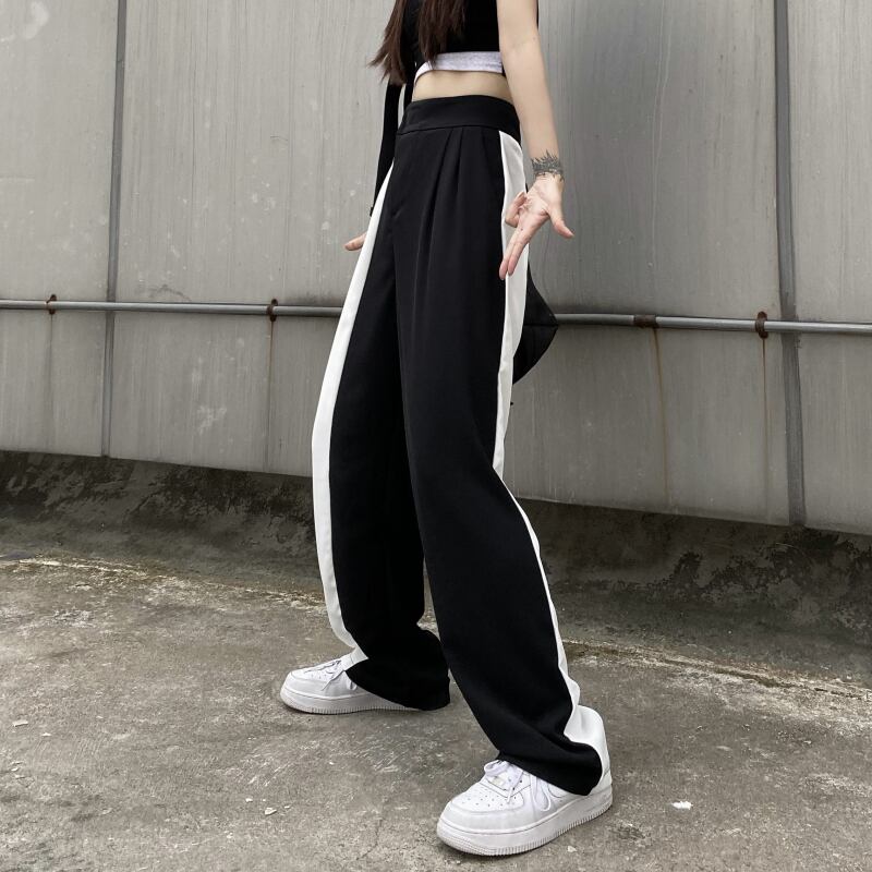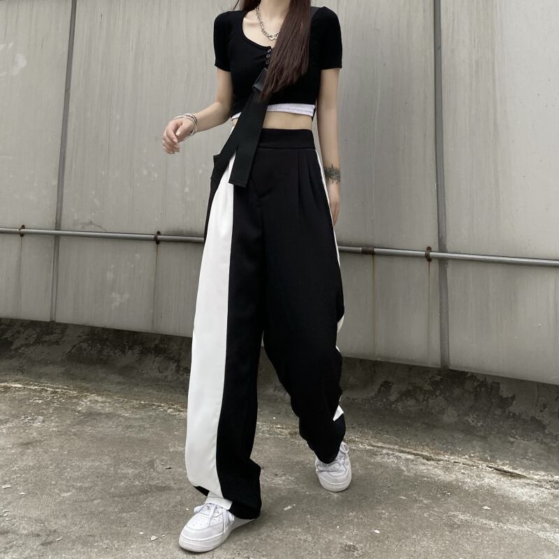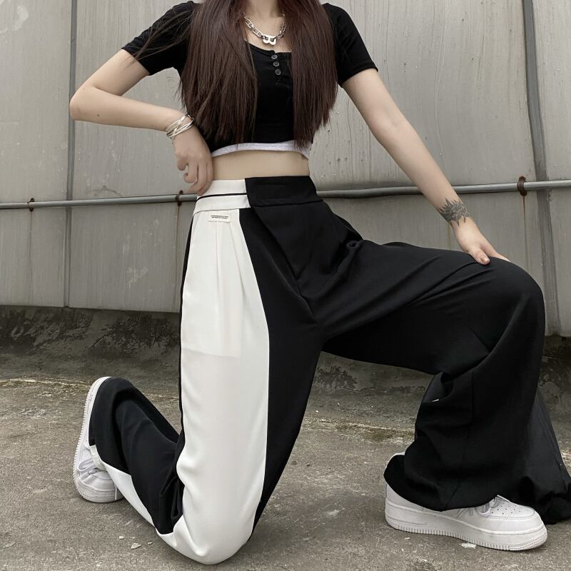 ウェストカジュアルパンツ 夏服トレンドブラックホワイトルーズ薄手 夏物 ステッチ ウエスト デーモン66152849627