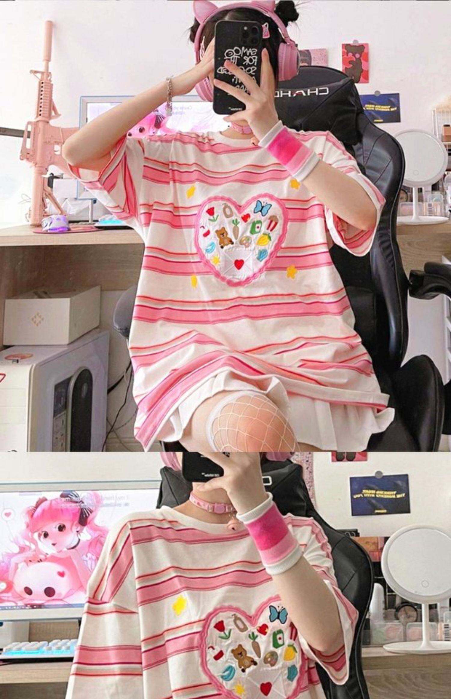 ストライプTシャツレディース夏服韓国ファッショントレンドスタンダード刺繍ルーズトップス レトロ 大人ガーリー スウィート キュート カジュアル 夏物 スタイル デーモン85803737852