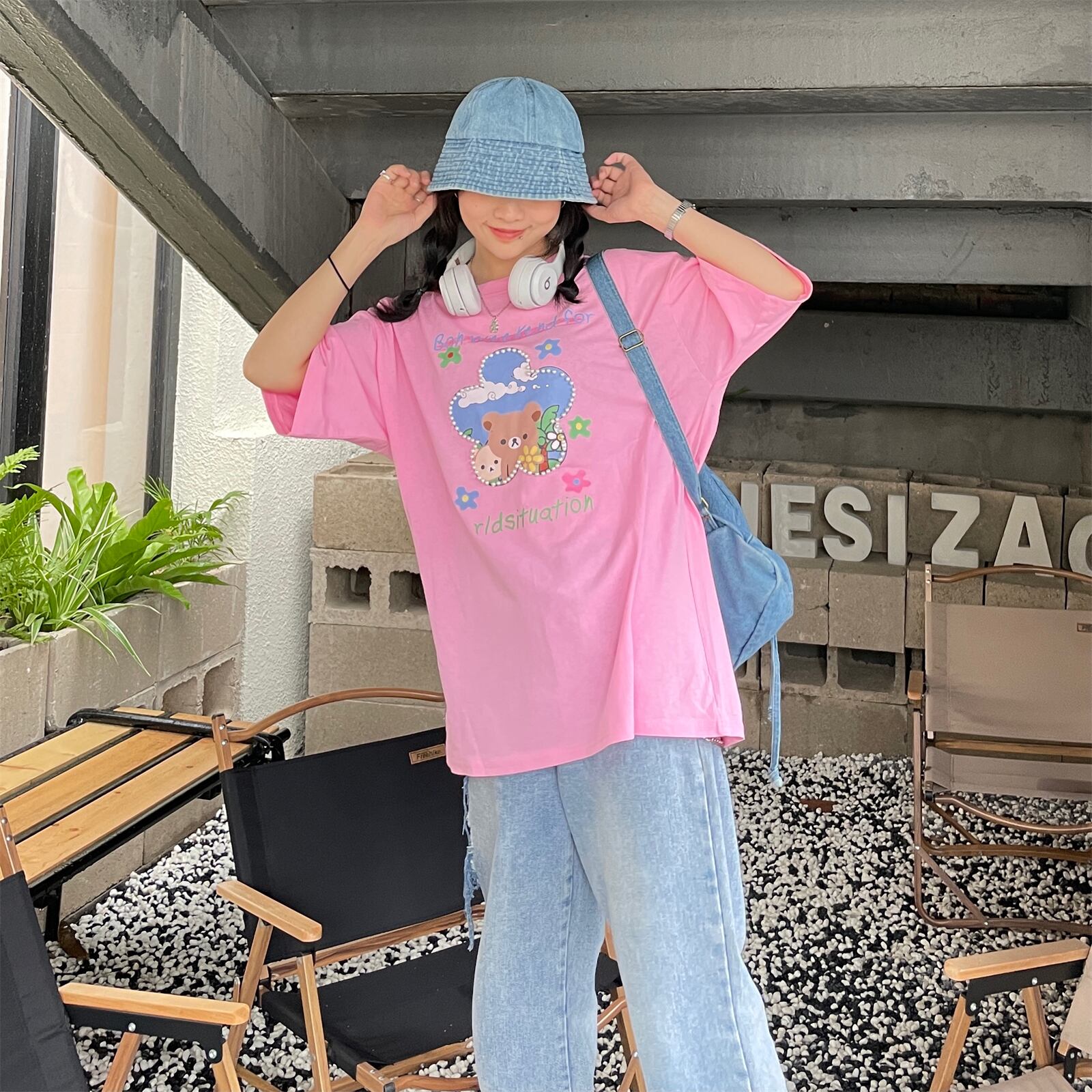 Tシャツレディース夏服韓国ファッショントレンドパールプリント柄ルーズトップス 大人ガーリー スウィート キュート カジュアル 夏物 真珠 スタイル デーモン4239142906
