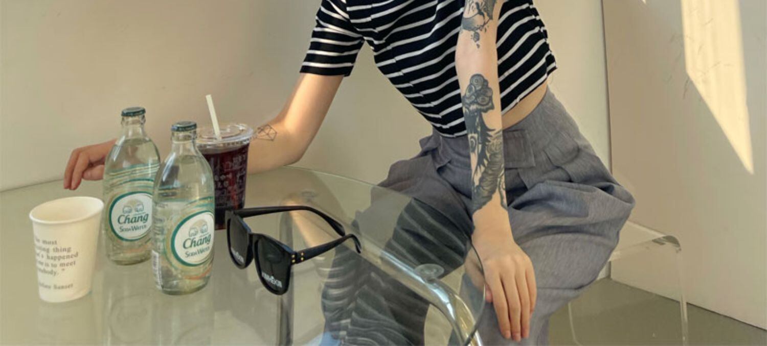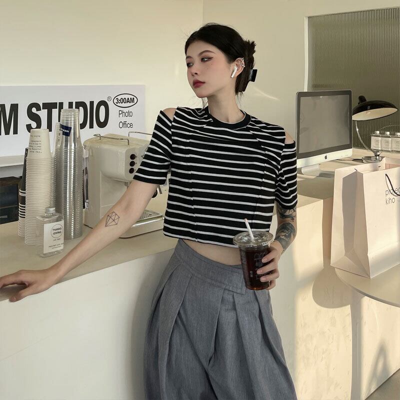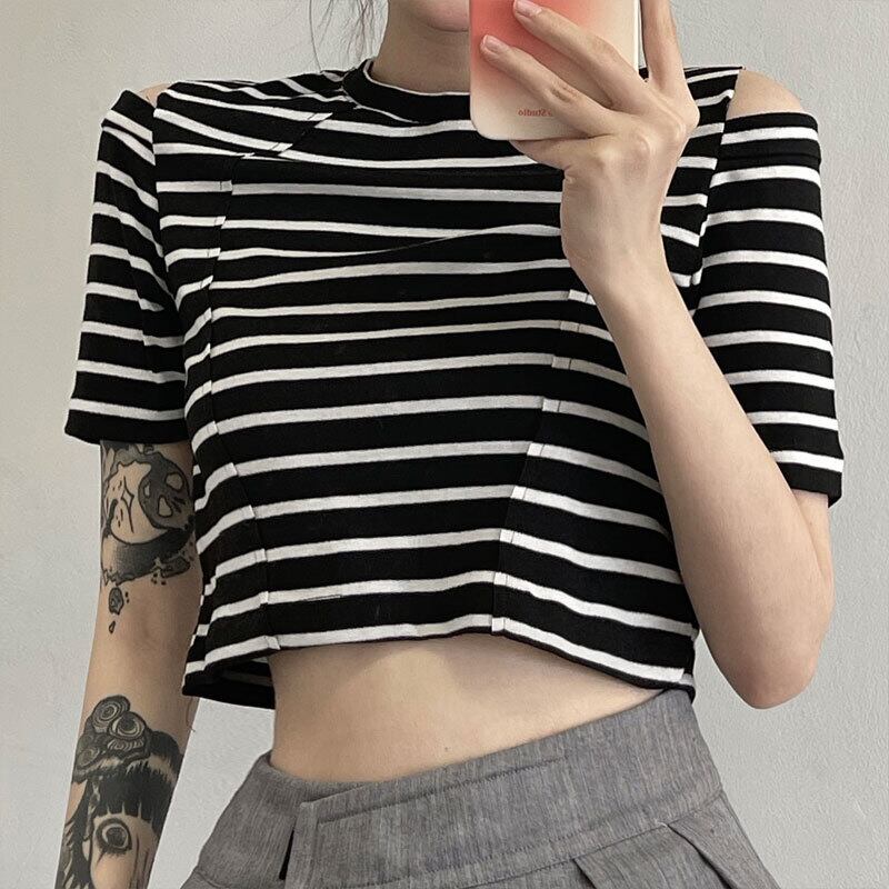 ショートストライプTシャツレディース夏服韓国ファッショントレンドスリムトップス 夏物 オフショルダー ボーイズ デーモン970396510