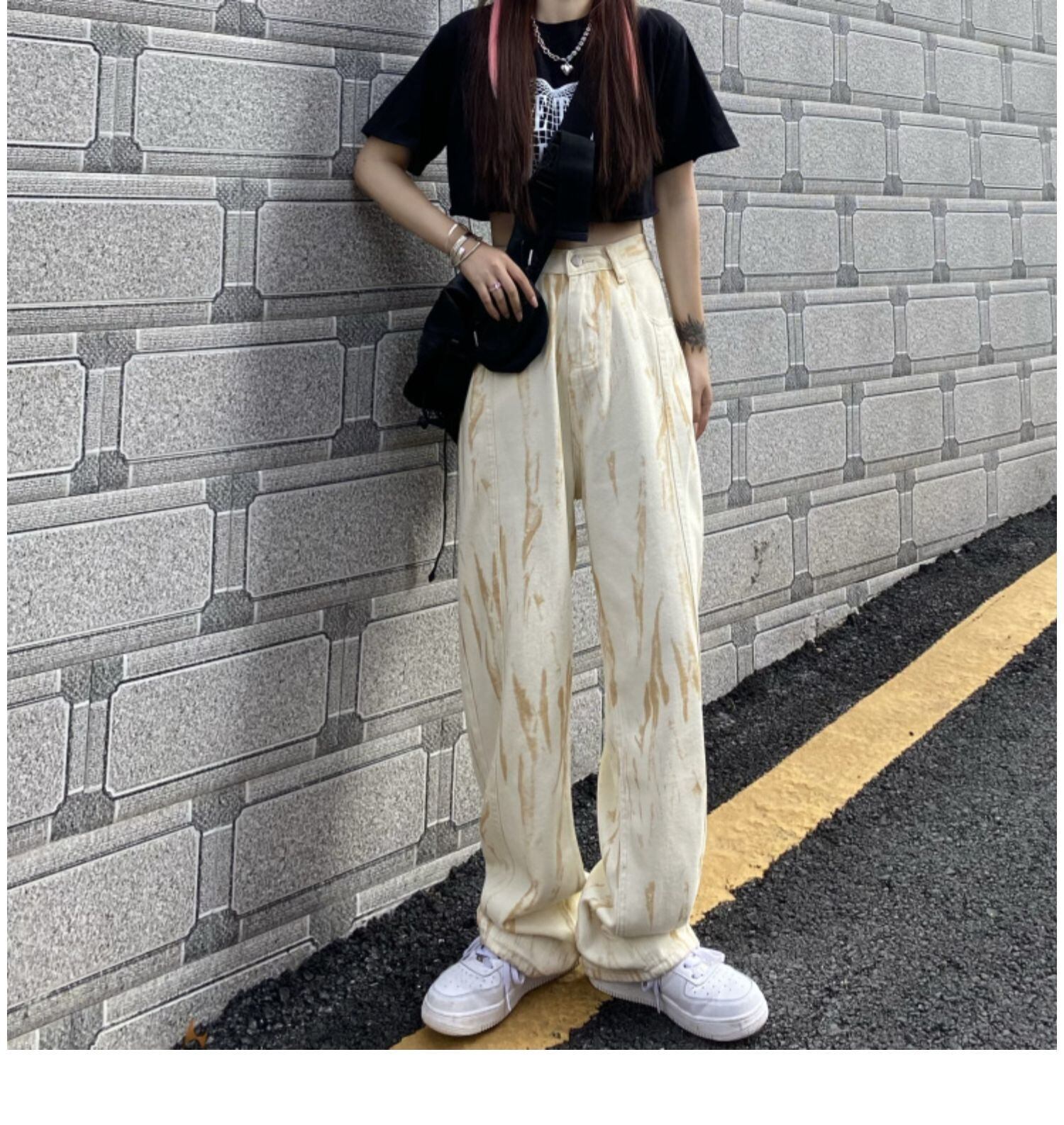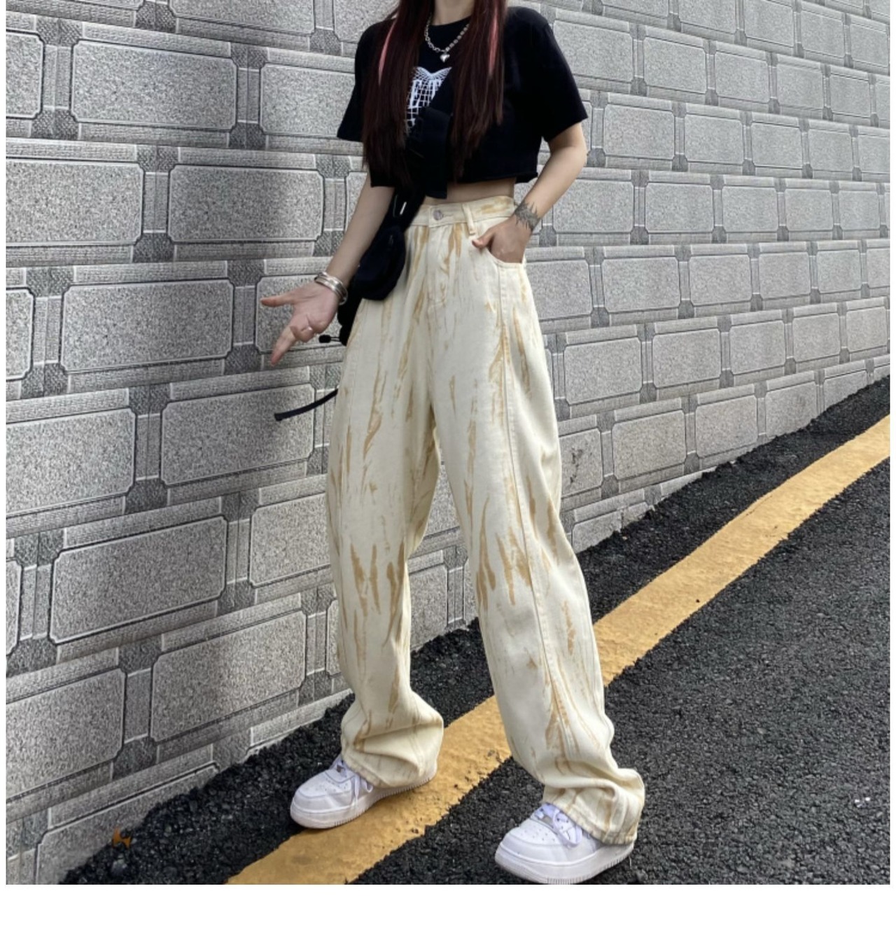 ジーンズ レディース夏服トレンドカラープリントワイドレッグルーズハイウェストウェスト薄手パンツ ストリート 夏物 ワイドパンツ ボーイズ ウエスト デーモン87949493249