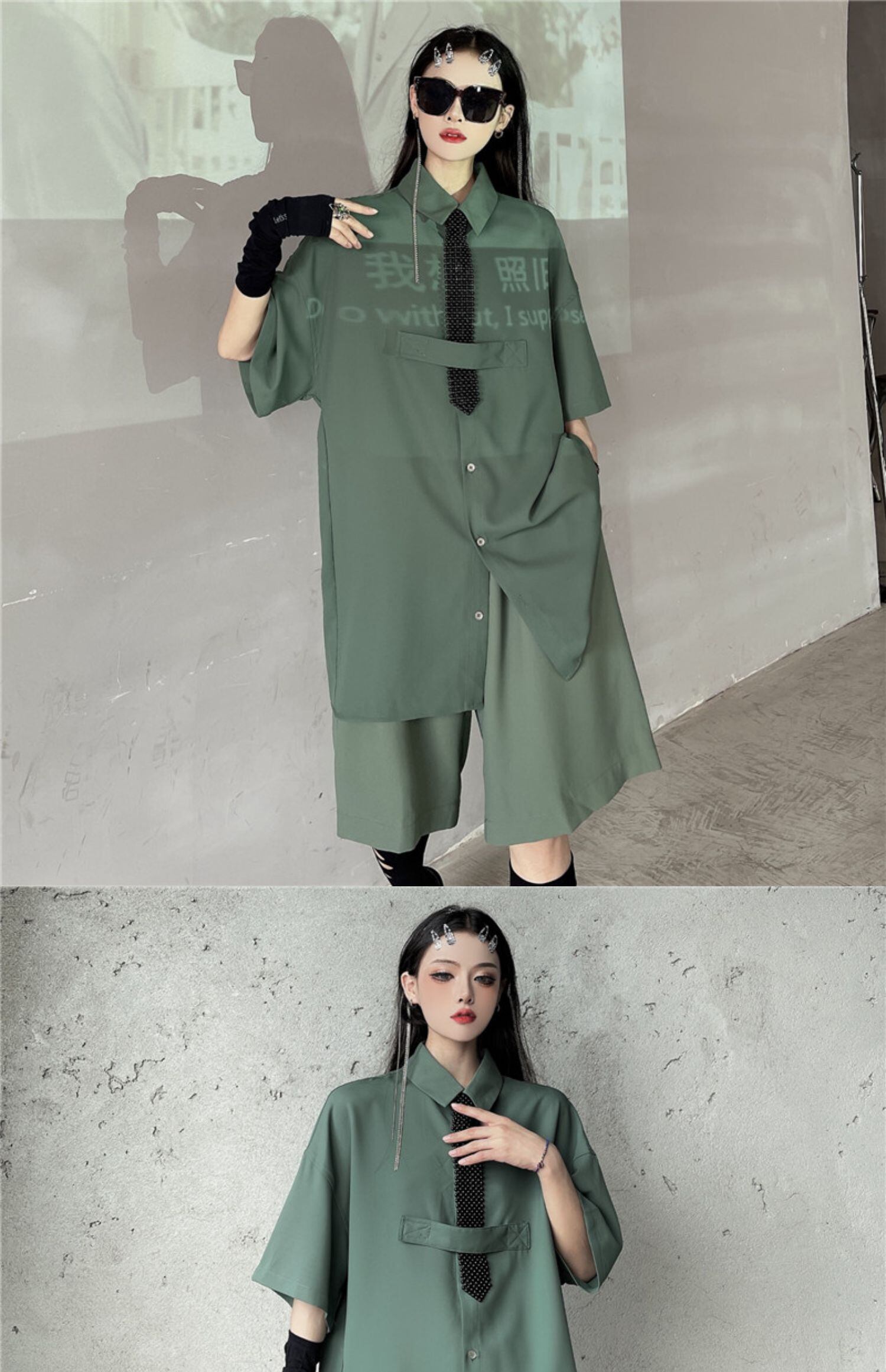 色:緑のシャツ,グリーンパンツ,ブラックパールネクタイ