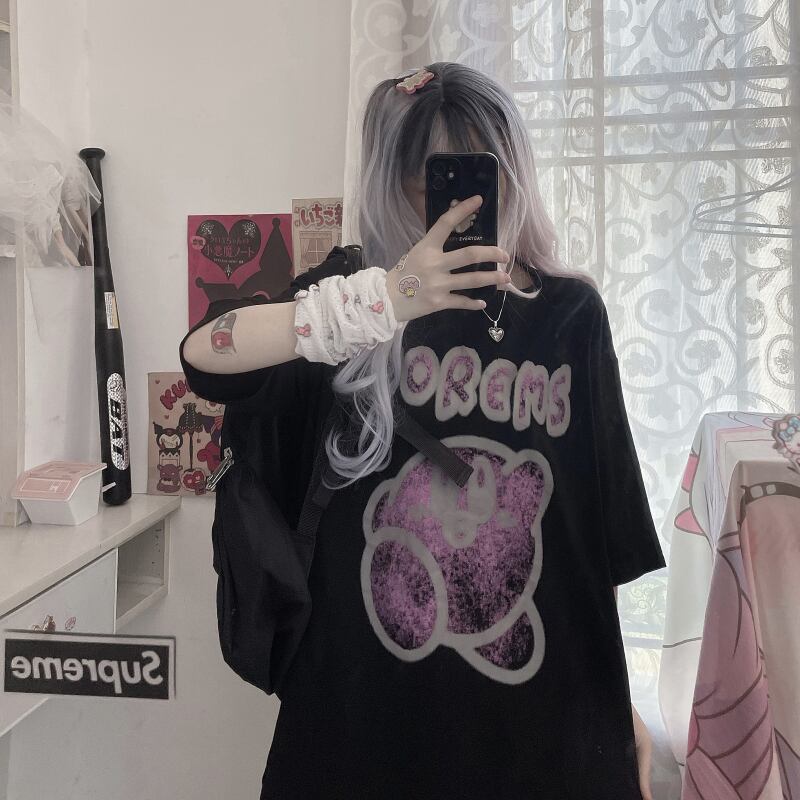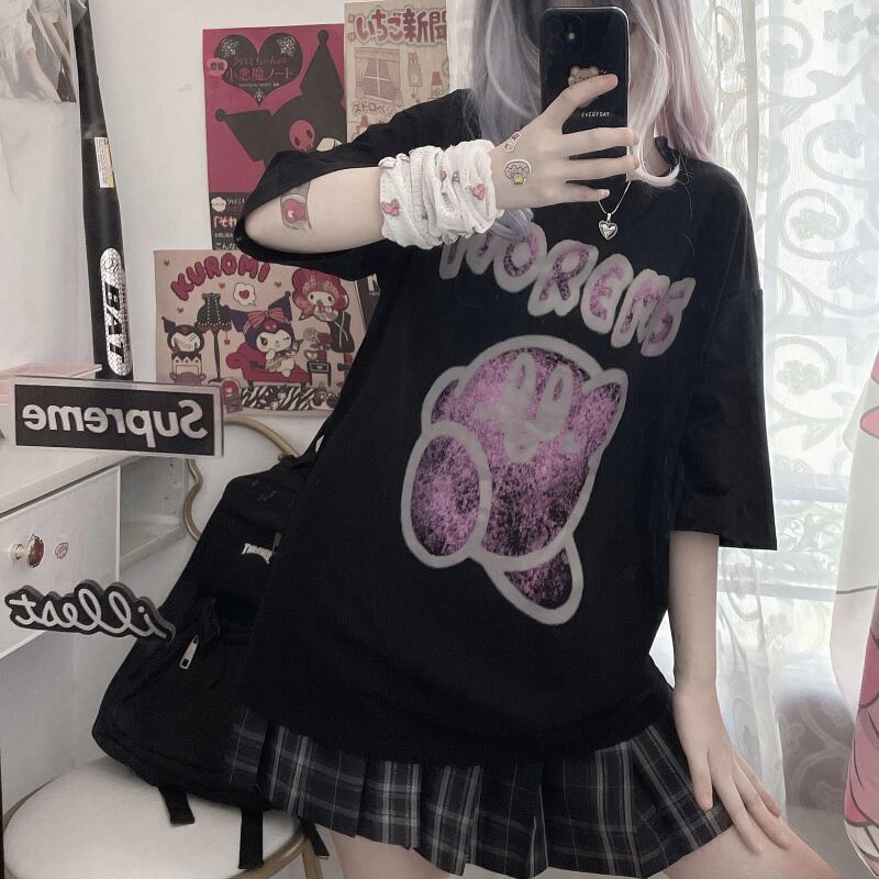 ブラックトップス 夏服韓国ファッショントレンドスタンダードプリントルーズTシャツ レトロ 大人ガーリー スウィート キュート カジュアル 夏物 スタイル デーモン16309103927