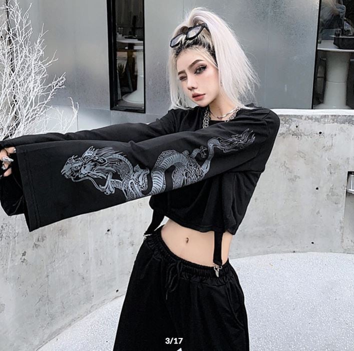 ショートTシャツシャツ レディース秋物薄手ダークブラックシャツ ロンT 個性的 トップス 長袖 レディース ショート丈 ロンティー ドラゴン 黒コーデ ゴシック へそ出し オータム デーモン94223330278