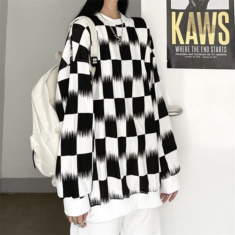 格子柄セーター レディース秋物韓国ファッションNEWスタンダードルーズラウンドネックシャツ ロング レトロ オータム Oネック スタイル 長袖 デーモン68959404946