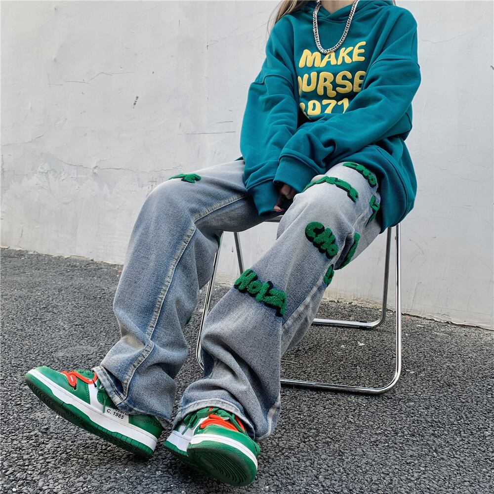 色:緑の群がったジーンズ