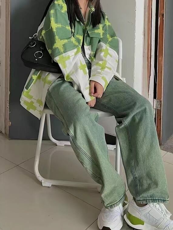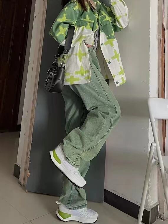スタンダードグリーンジーンズ スプリングハイウェストルーズ薄手パンツ レトロ ストリート 春物 ウエスト デーモン44030030573