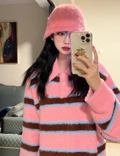 ストライプラウンドネックセーター スプリング韓国ファッションNEWニット ピンク 春物 Oネック スタイル デーモン12080721096