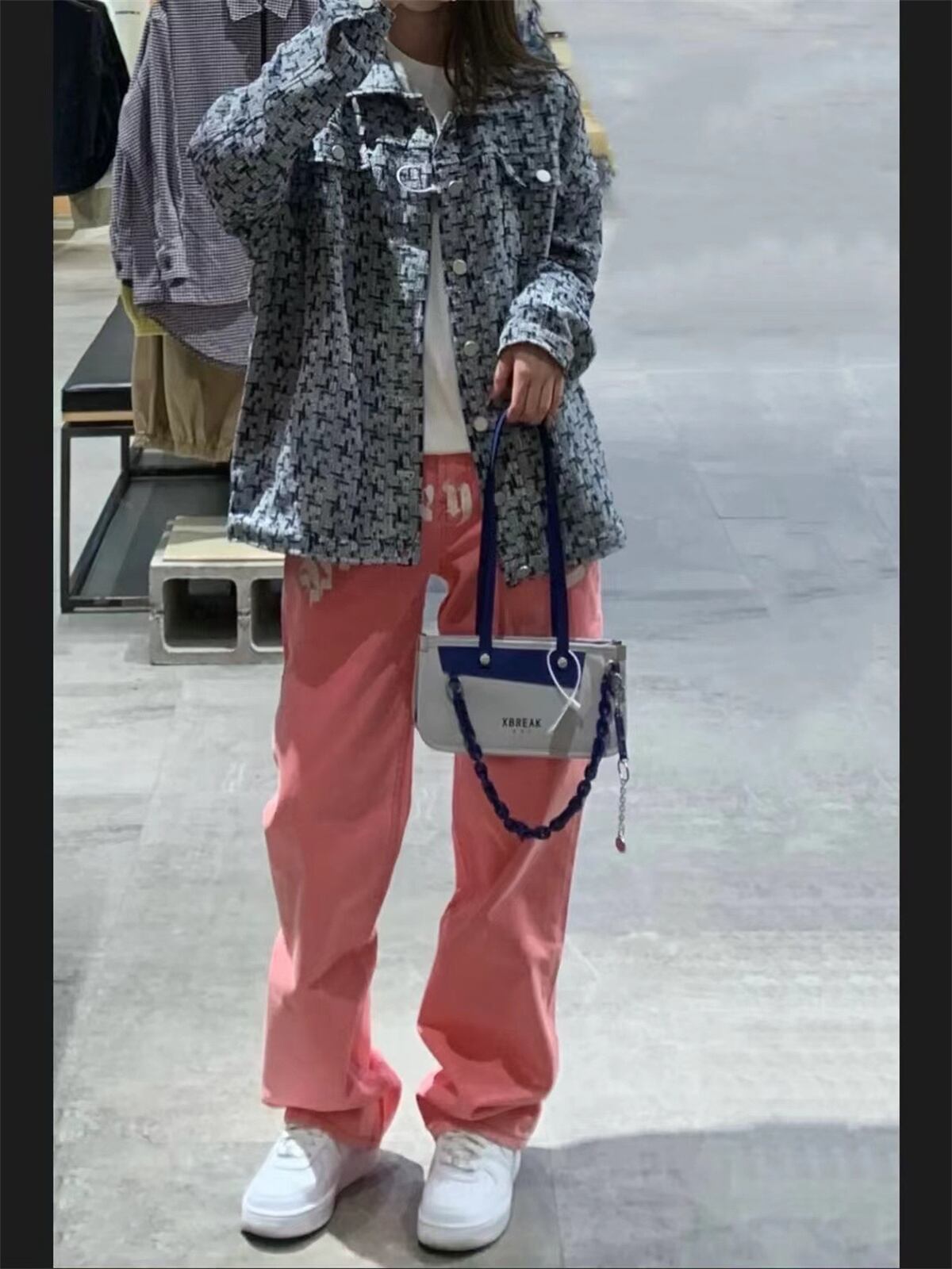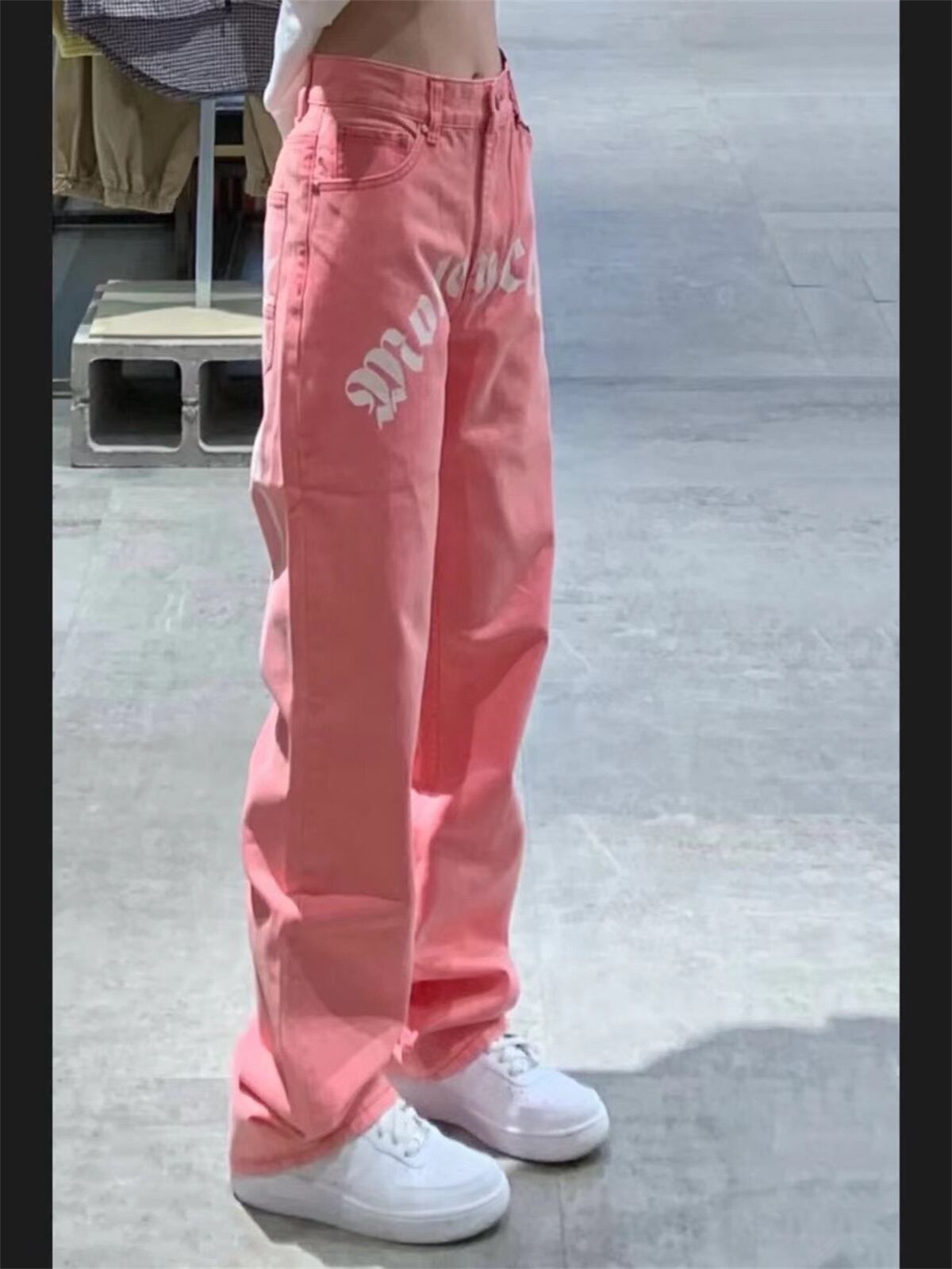 プリント柄ジーンズ スプリングハイウェストウェストルーズ薄手ワイドレッグパンツ ピンク ストリート 春物 ワイドパンツ ウエスト デーモン96257435174
