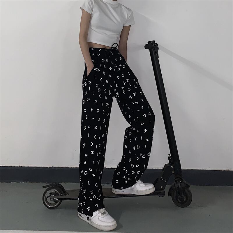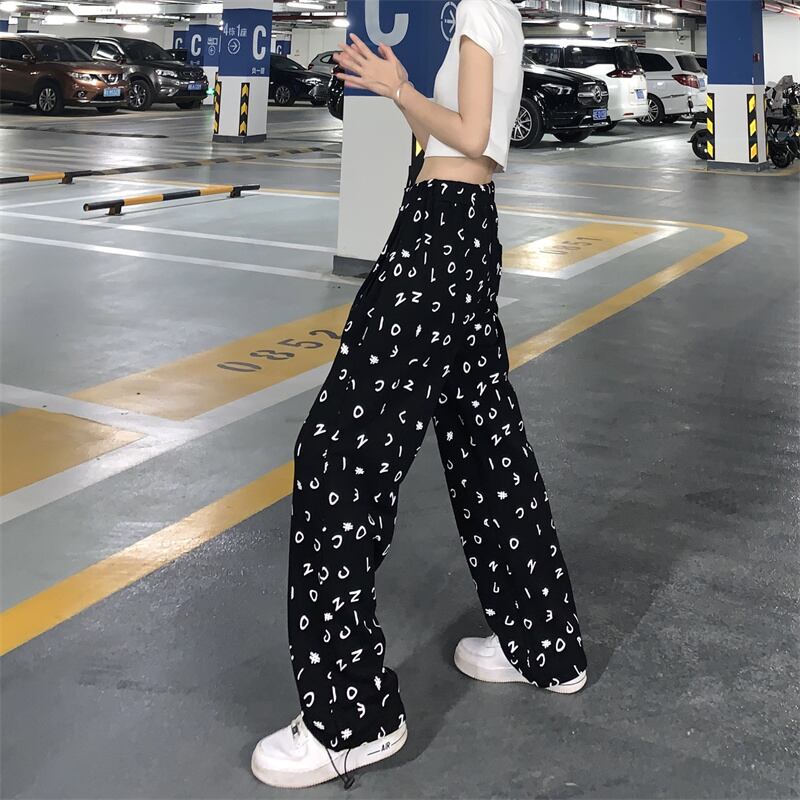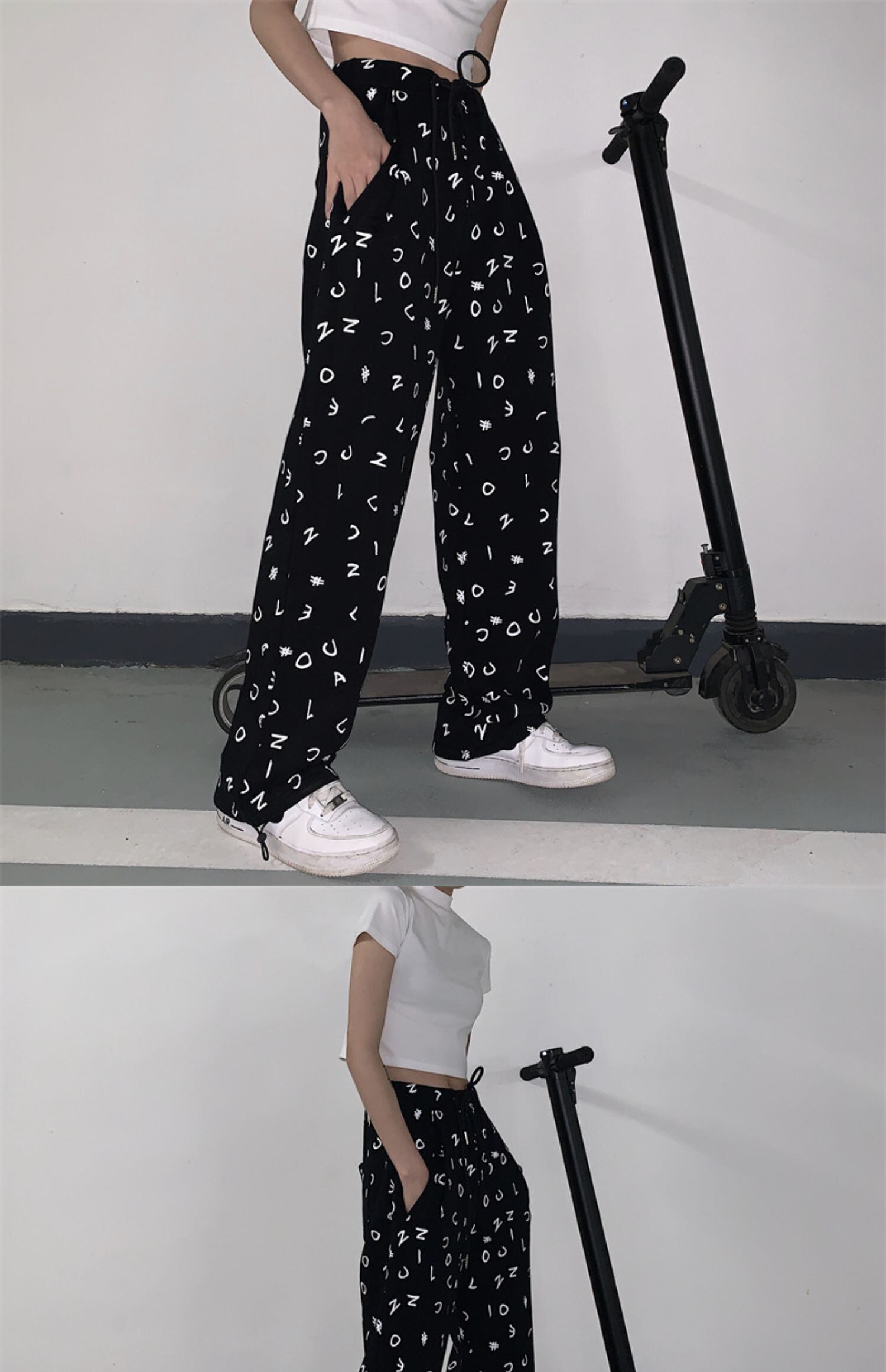 ブラックスプリングプリントルーズ薄手レギンス ハイウェストウェストワイドレッグカジュアルレディース 春物 ワイドパンツ ウエスト デーモン2380828193
