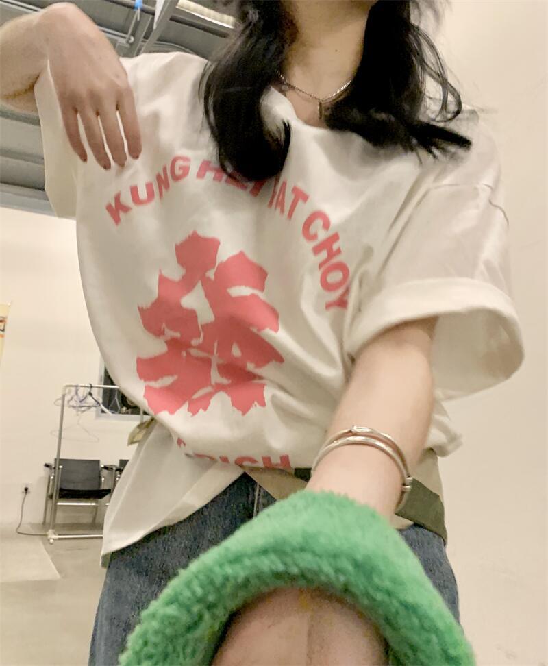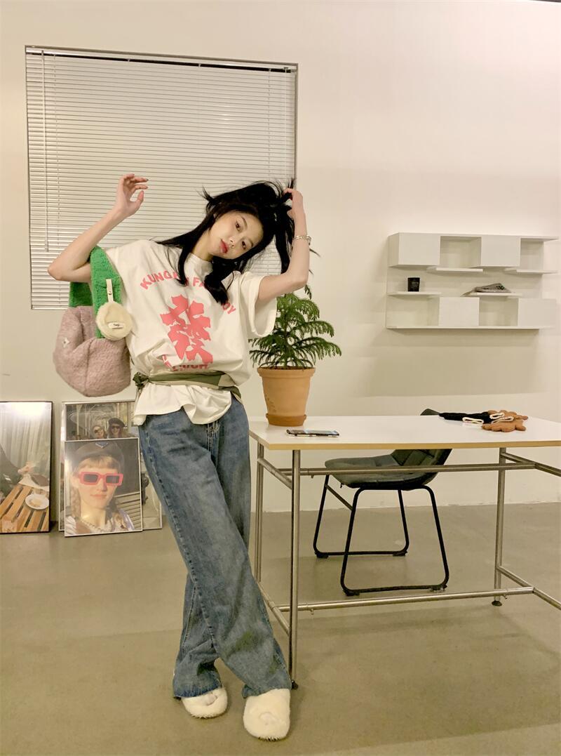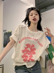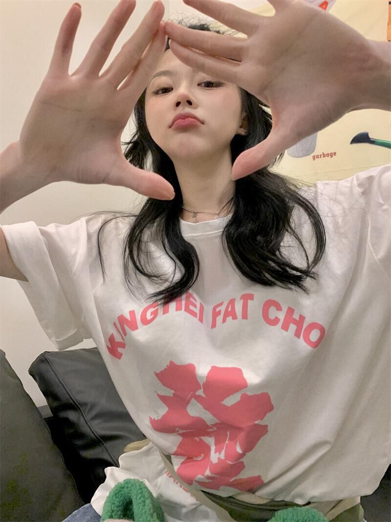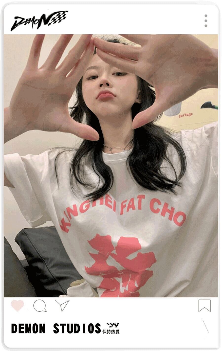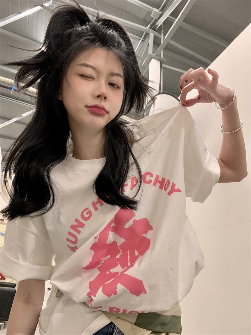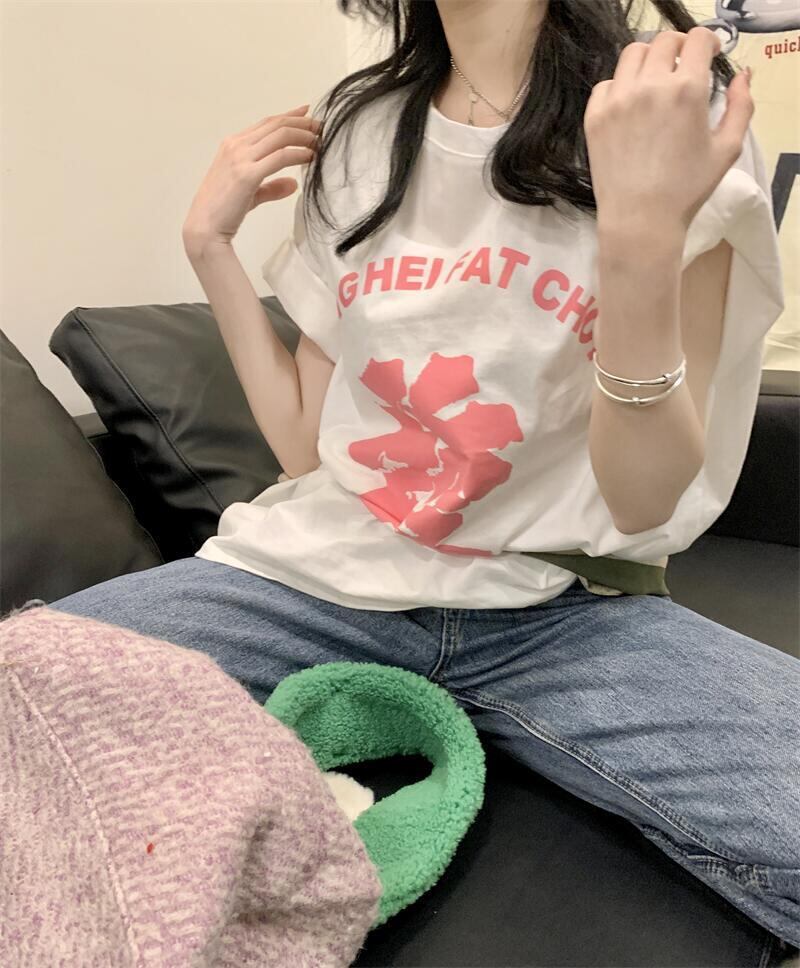 自然派プリント柄トップス スプリング韓国ファッションホワイトルーズTシャツ 春物 スタイル デーモン61655845047