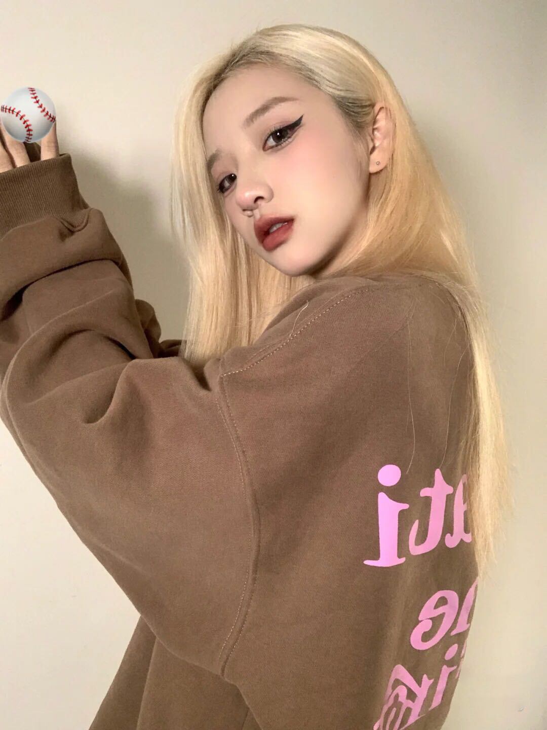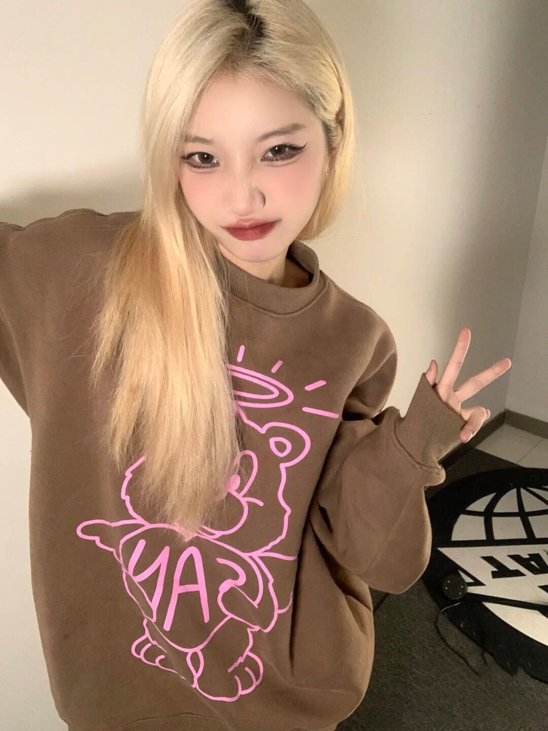 プリント柄ラウンドネックセーター スプリング韓国ファッションブラウンルーズトップス ロング 大人ガーリー スウィート キュート カジュアル 春物 Oネック スタイル 長袖 デーモン39870398123