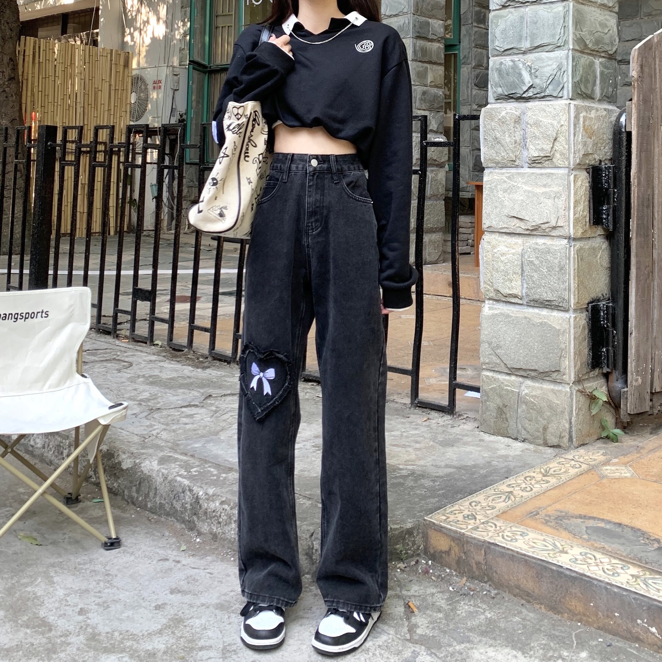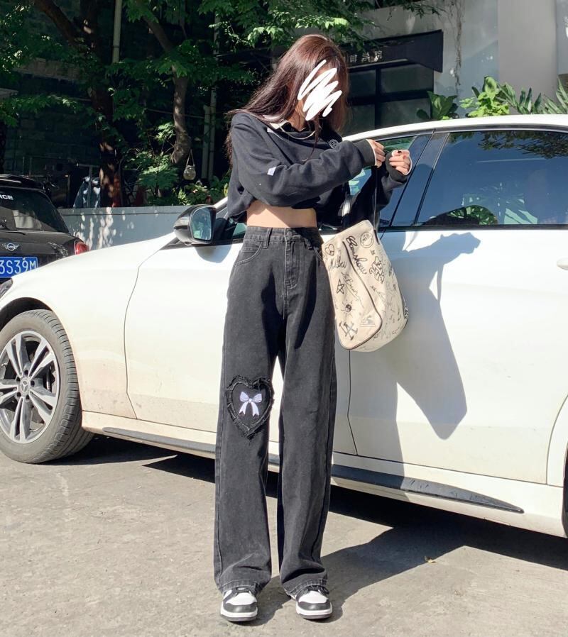 刺繍ジーンズ スプリングウェストルーズ薄手ワイドレッグパンツ ストリート 春物 ワイドパンツ ウエスト デーモン37505496084