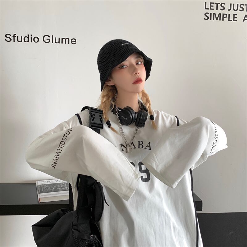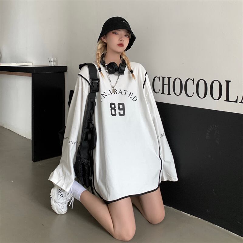 秋物薄手トップス Tシャツシャツ プリントホワイトルーズゆったり ロング オータム 長袖 デーモン57536101011