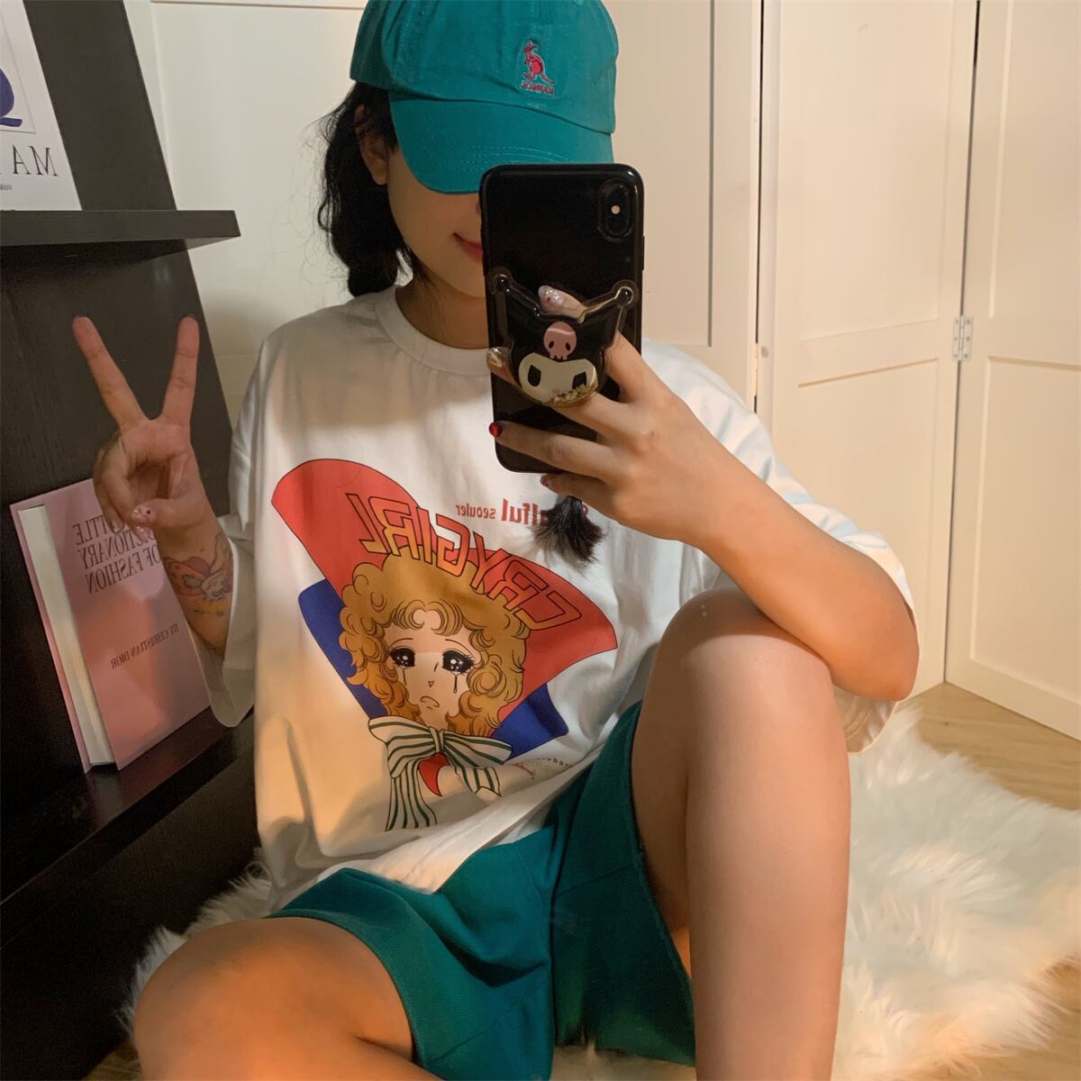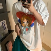 スプリングTシャツスタンダードプリント柄ホワイトルーズトップス レトロ 春物 デーモン99969077221