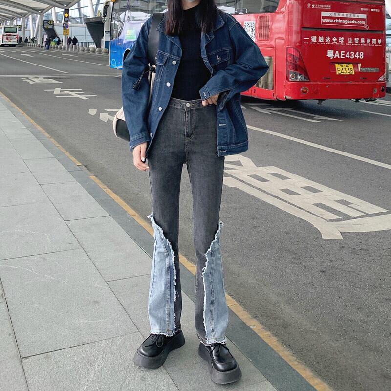 カラージーンズ スプリングハイウェストウェストルーズ薄手パンツ 春物 ステッチ ウエスト デーモン82387016596