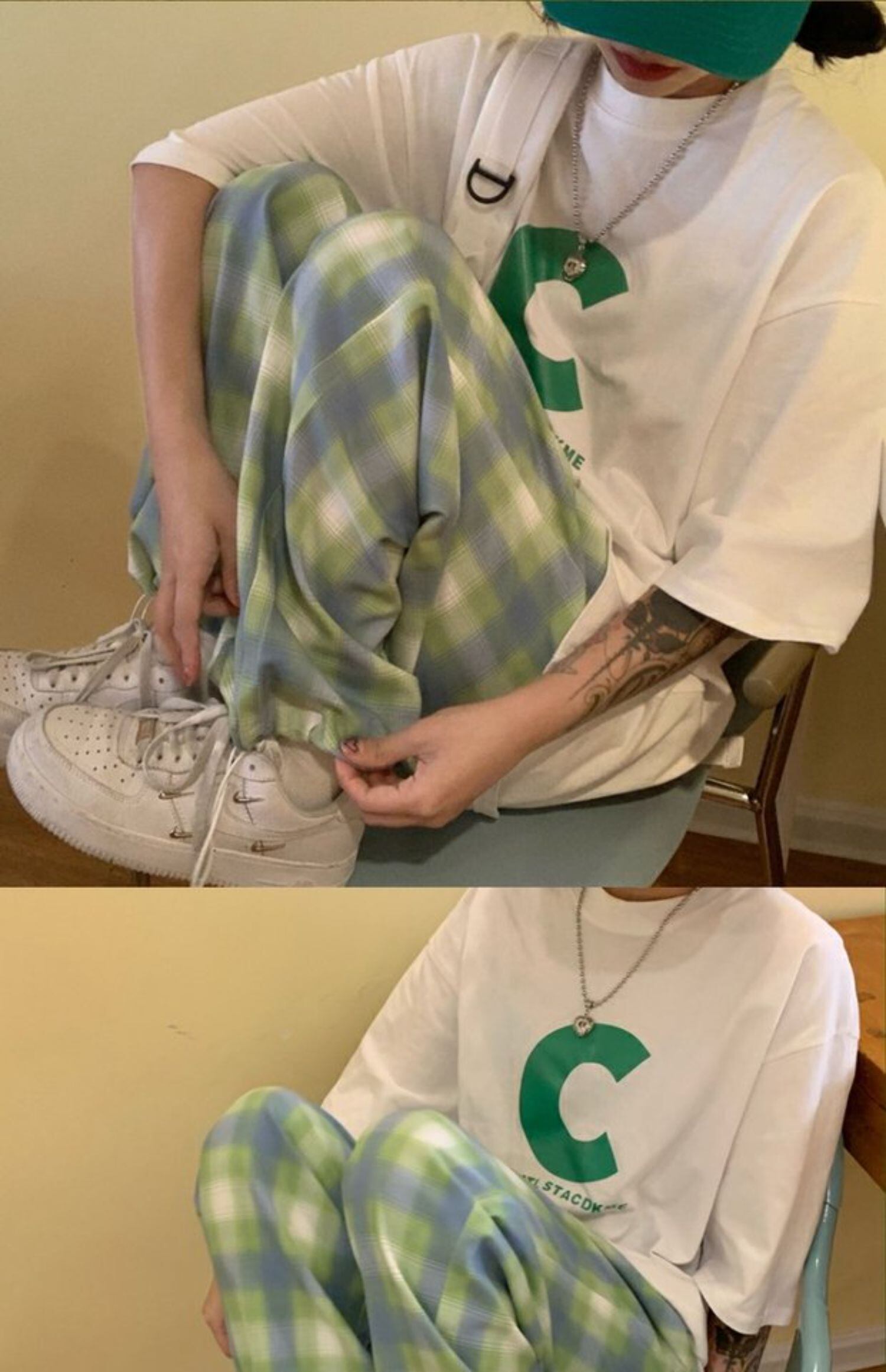 色:白いTシャツ,緑の格子縞