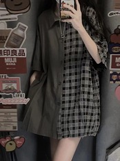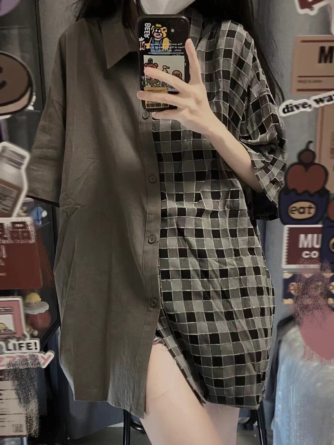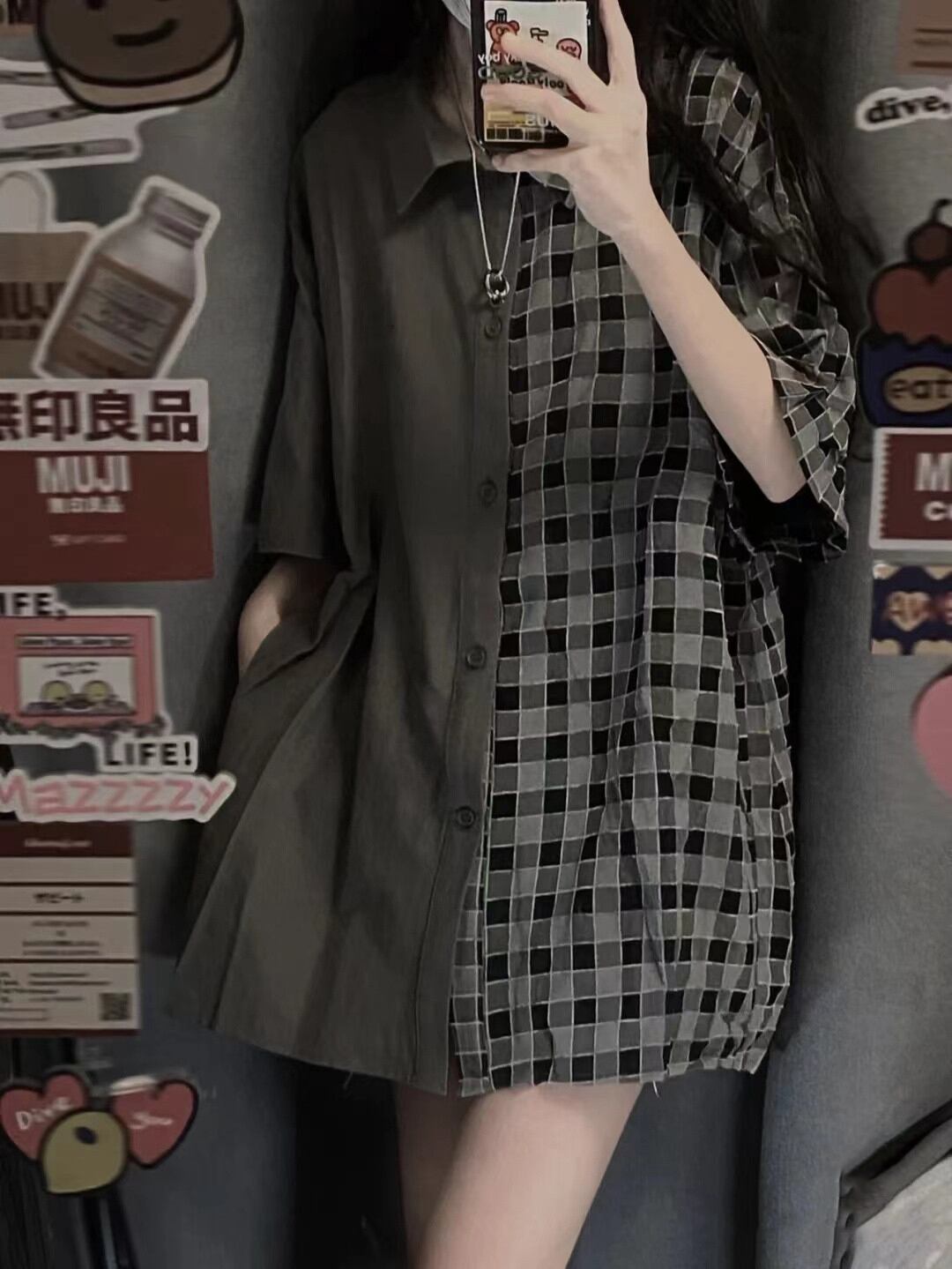 スタイル格子柄シャツ 夏服ルーズトップス 夏物 ステッチ デーモン63201073025