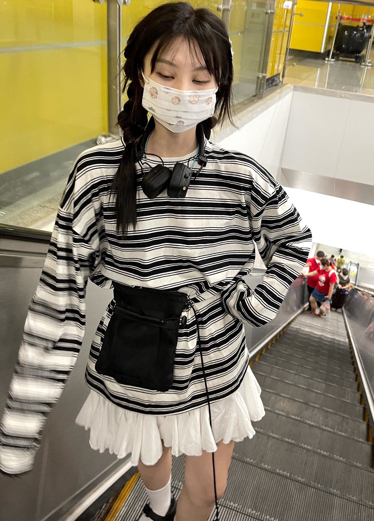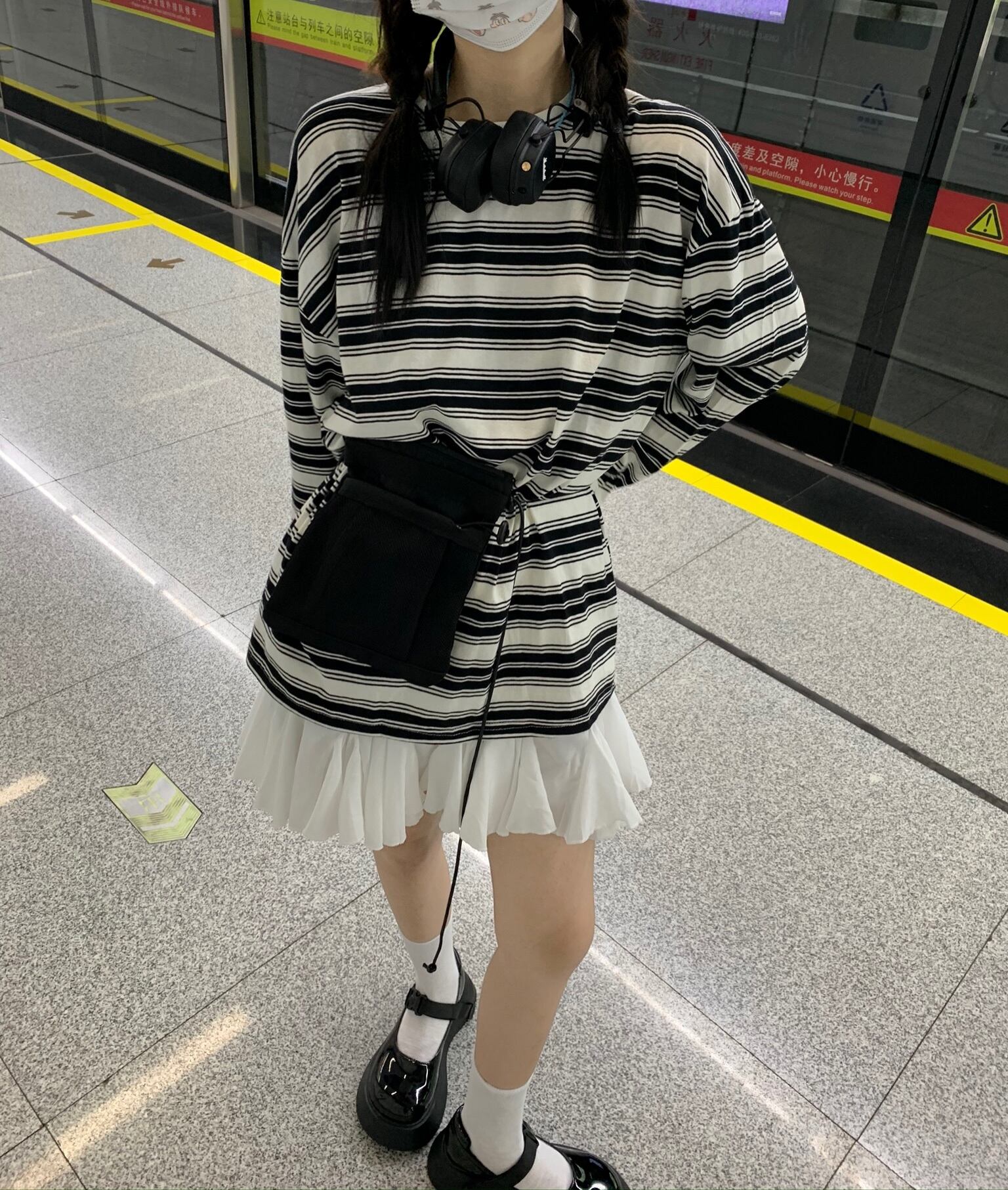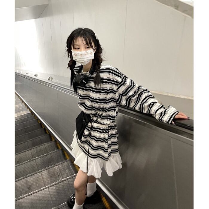 スプリングレディース韓国ファッションストライプTシャツホワイトスカート ロング ふわふわ 春物 スタイル 長袖 デーモン55093585257