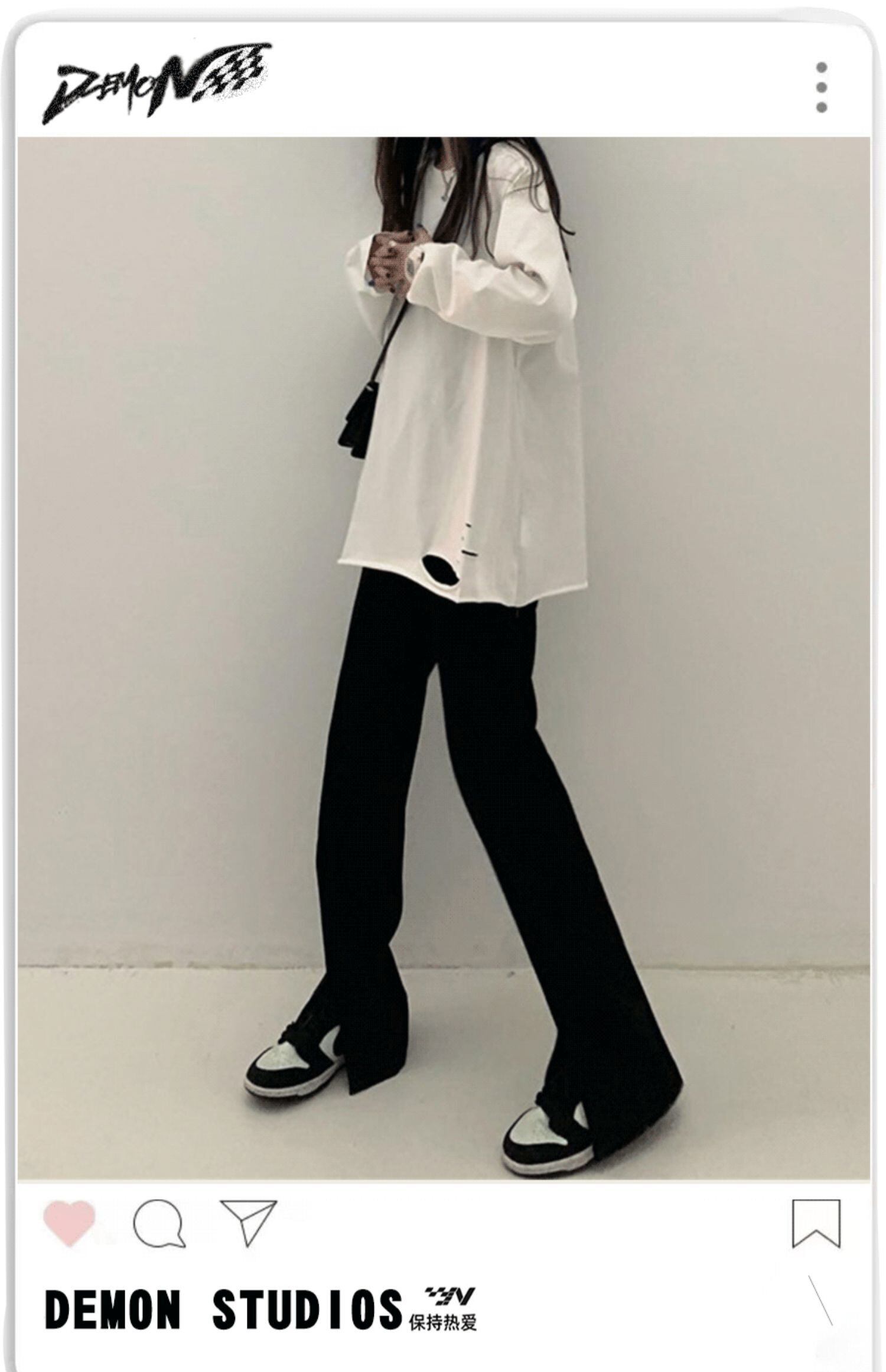 スリットパンツ スプリングブラックハイウェストカジュアルルーズ薄手 春物 ウエスト デーモン46140302159