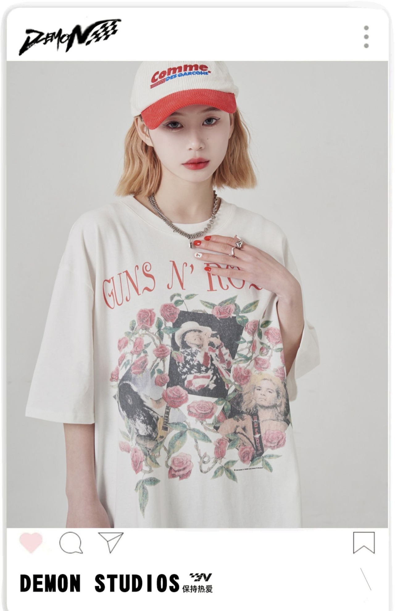 フローラルプリント柄トップス 夏服ルーズTシャツ 夏物 花柄 デーモン53833296096