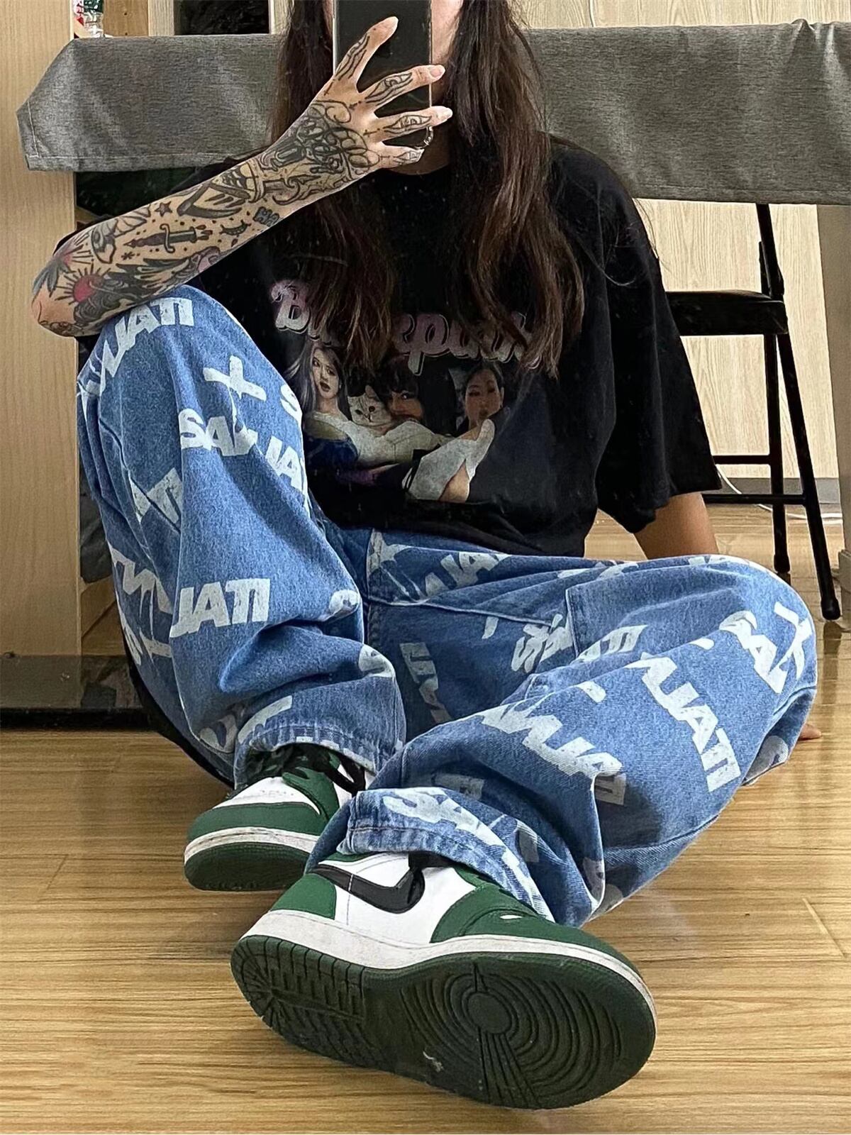 プリントジーンズ 夏服ハイウェストルーズ薄手パンツ 夏物 ウエスト デーモン48007182470