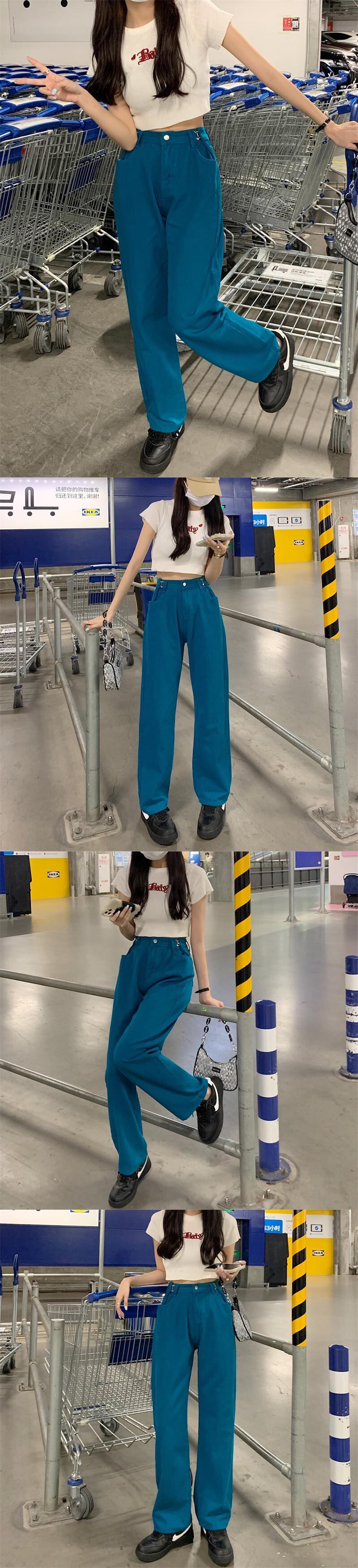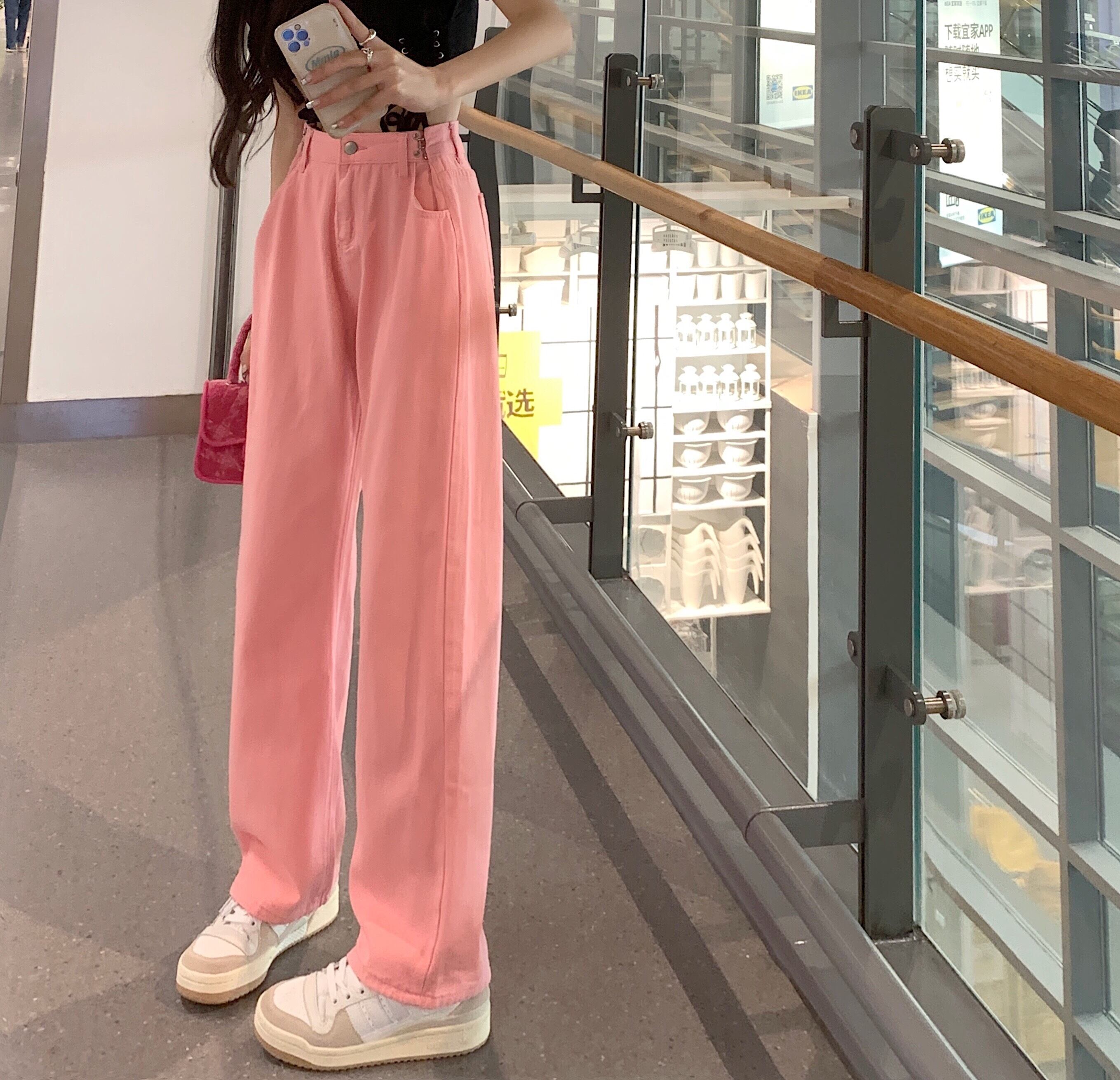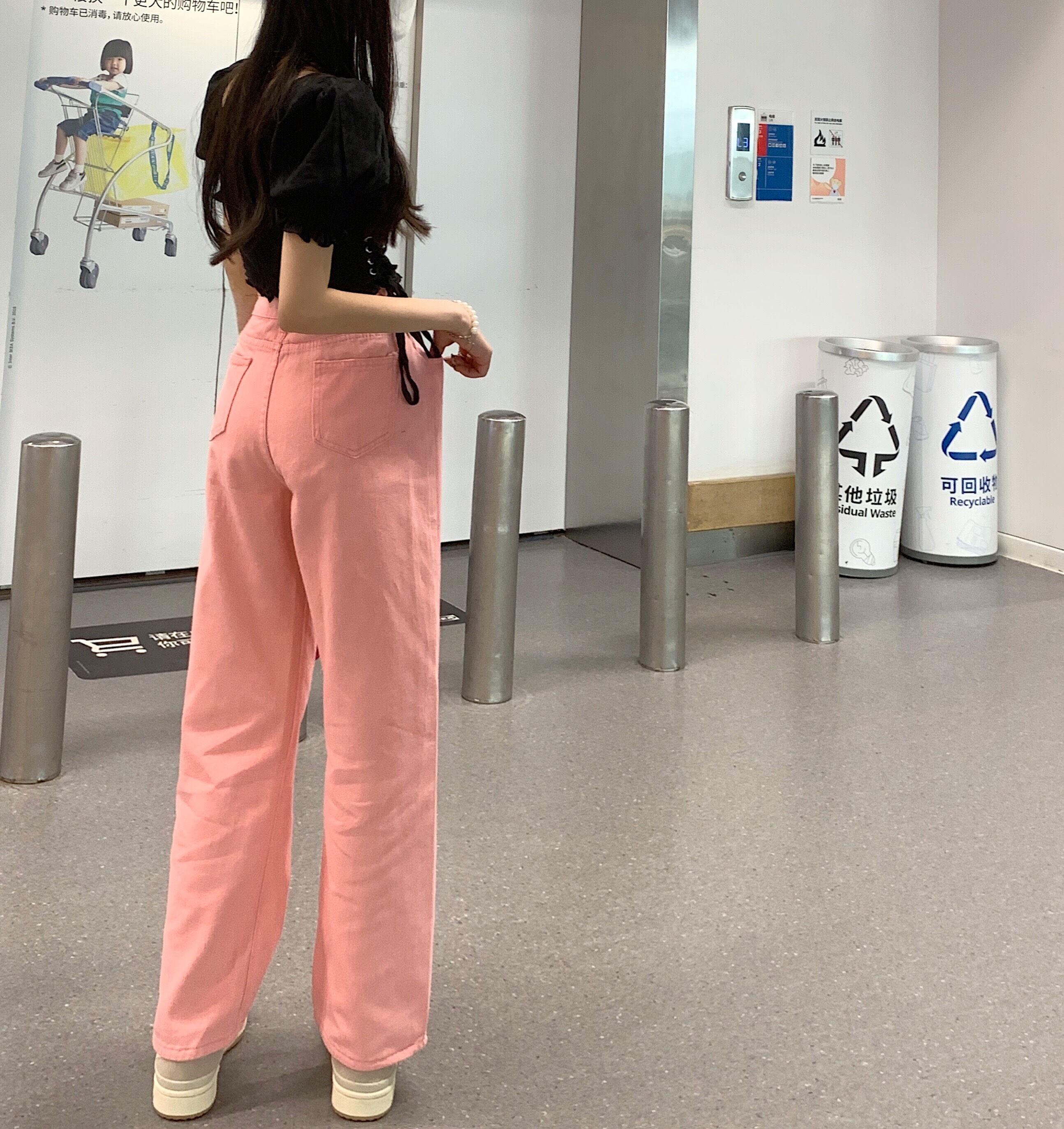 ハイウェストウェストジーンズ 夏服ホワイトルーズ薄手パンツ ピンク ストリート 夏物 ウエスト デーモン94813417792