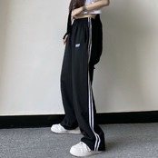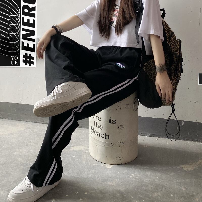 ストライプカジュアルパンツ 夏服ブラックハイウェストルーズ薄手 夏物 ウエスト デーモン28239490605