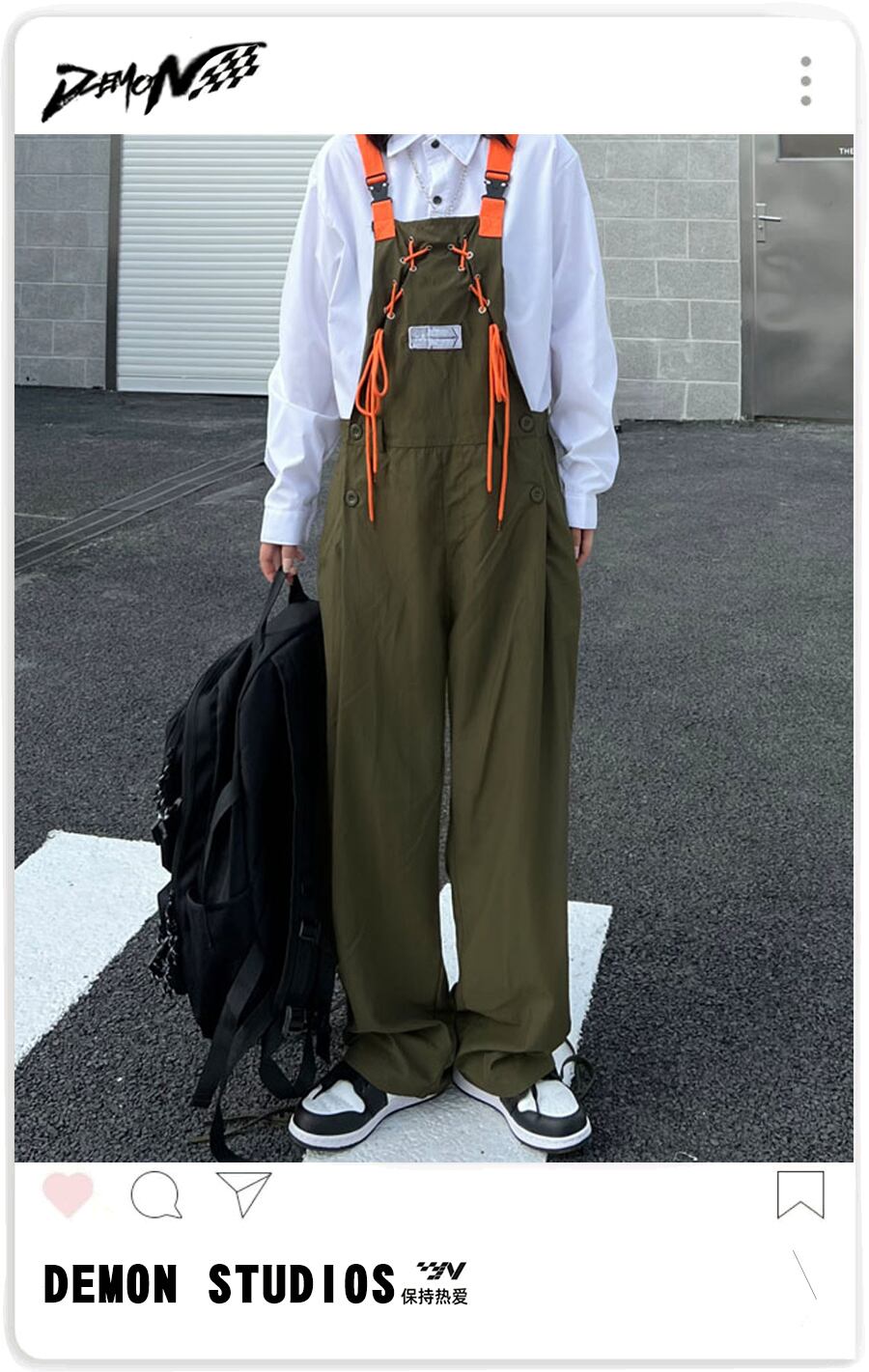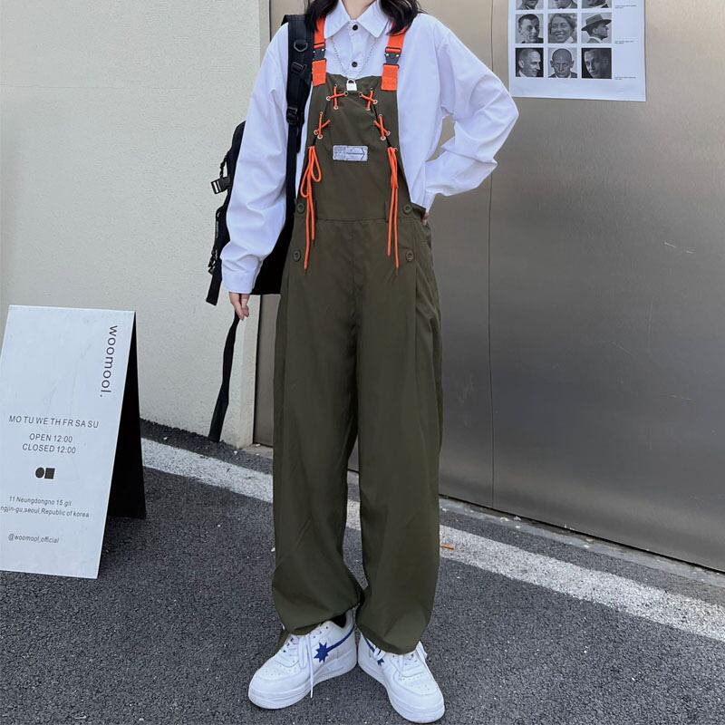 色:ミリタリーカラーのオーバーオール,白のシャツ