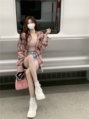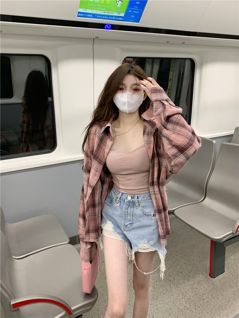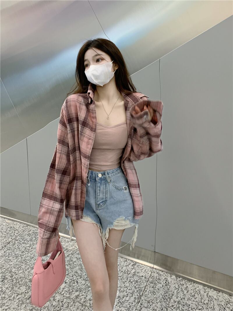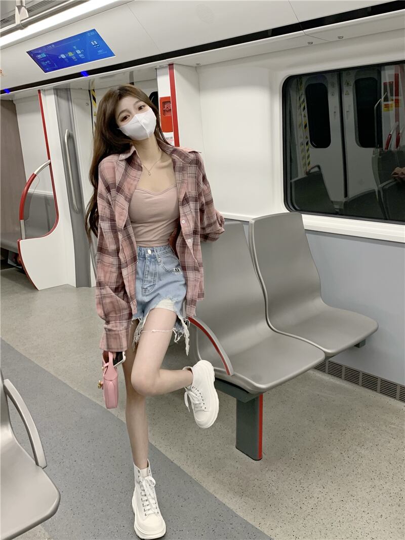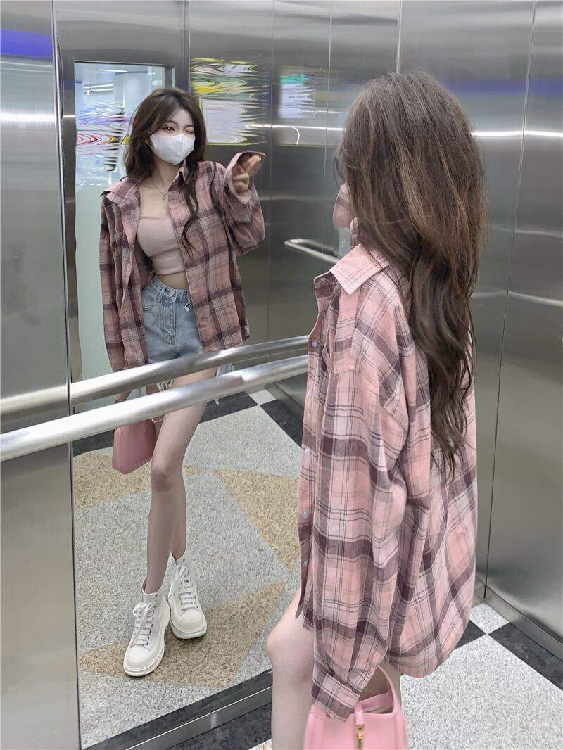 格子柄シャツ 夏服韓国ファッションスタンダードルーズトップス ロング ピンク レトロ ストリート 夏物 スタイル 長袖 デーモン48946530777