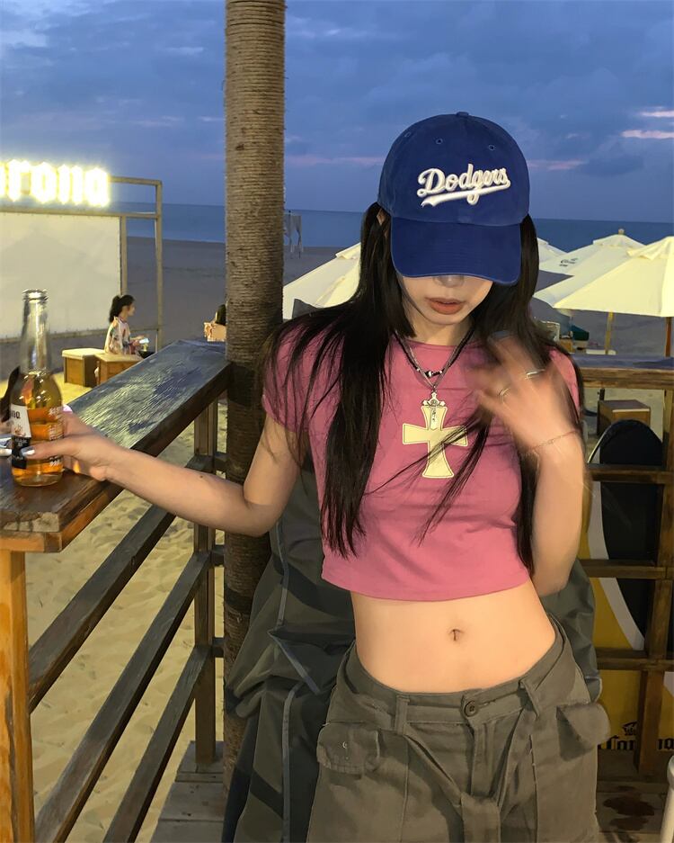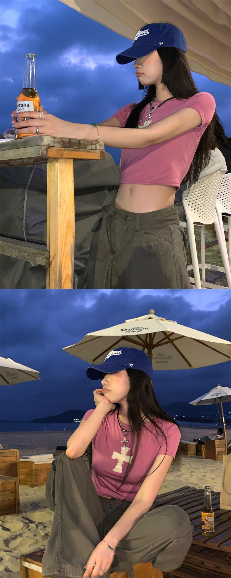 クロスショートTシャツ夏服スリムフィットトップス 夏物 デーモン82621734584