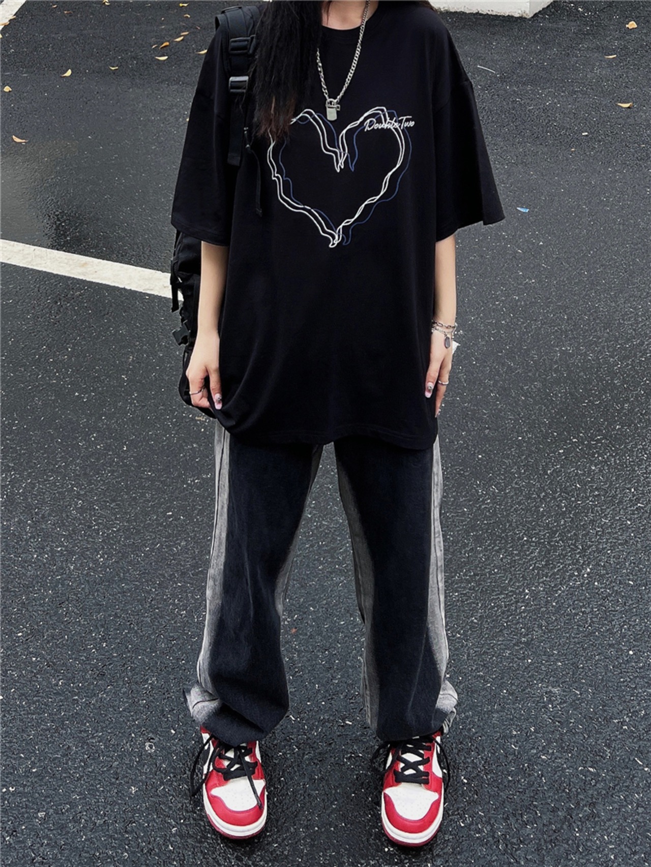 夏服スタンダードプリント柄Tシャツブラックルーズトップス レトロ 夏物 デーモン6265985800