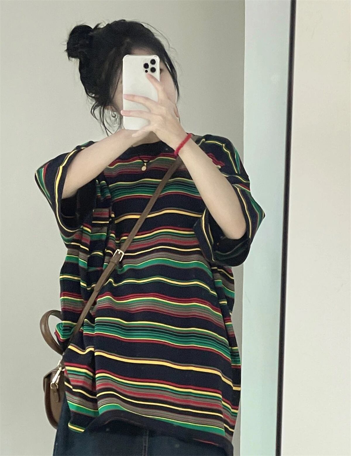 ストライプTシャツシャツ 夏服ルーズスタンダードラウンドネックゆったりトップス レトロ 夏物 Oネック デーモン1455998445
