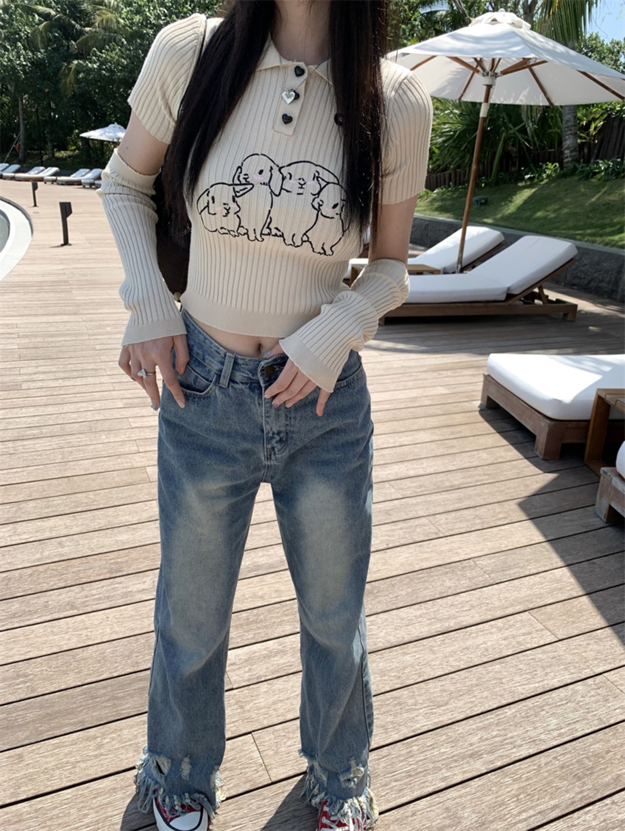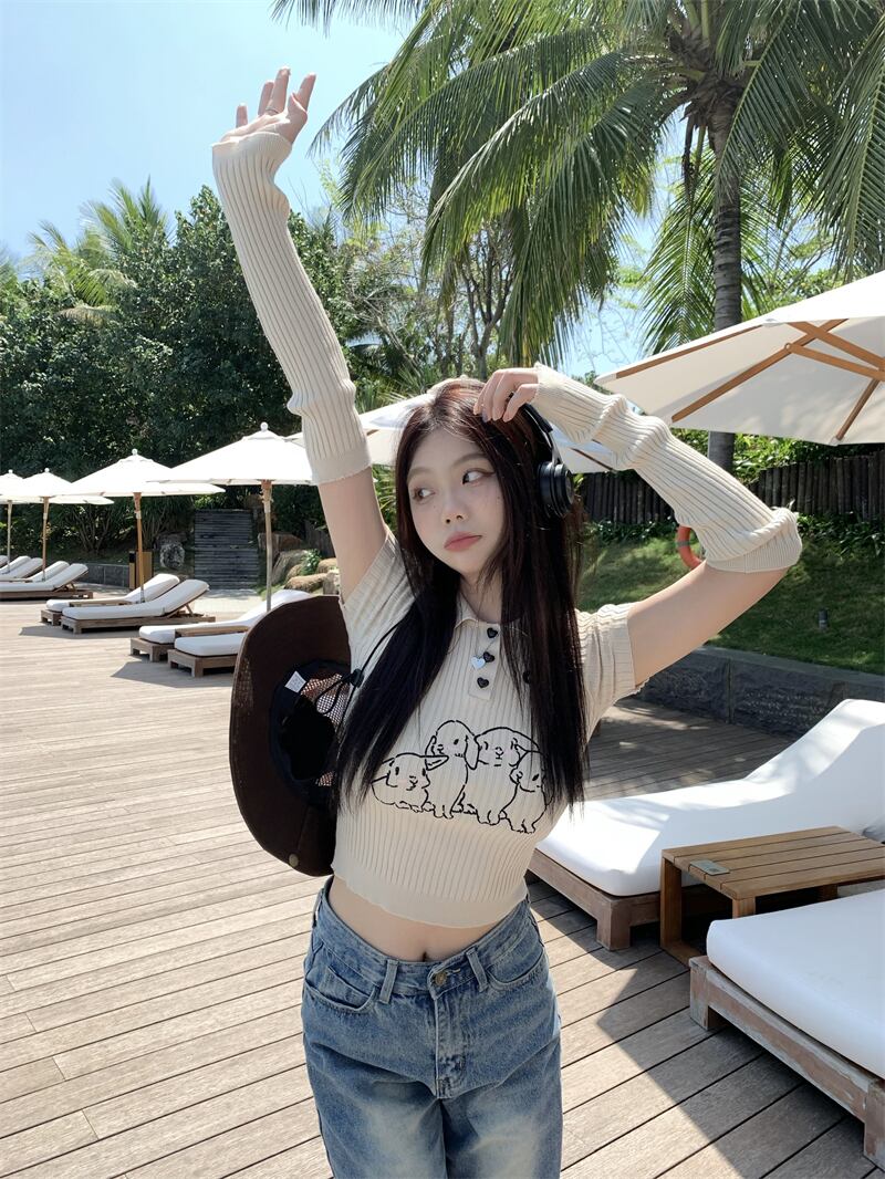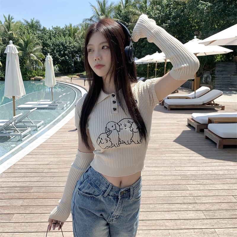 ニットシャツ 夏服刺繍ショートトップス 大人ガーリー スウィート キュート カジュアル 夏物 デーモン44542553596