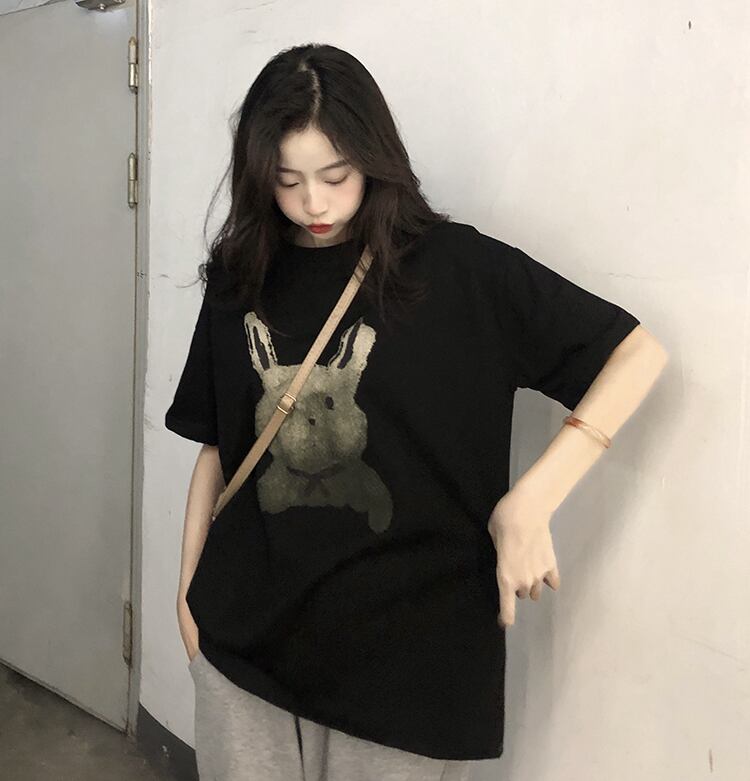 ショートTシャツ夏服韓国ファッションプリント柄ブラックルーズトップス 夏物 スタイル デーモン18924222997