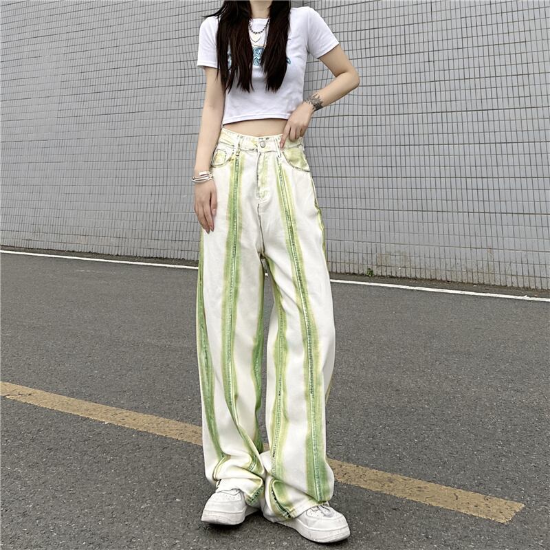 ストライプカラージーンズ 夏服ハイウェストウェストスタンダードルーズ薄手ワイドレッグパンツ レトロ 夏物 ワイドパンツ ウエスト デーモン48023236660